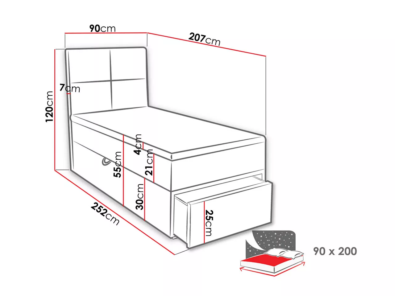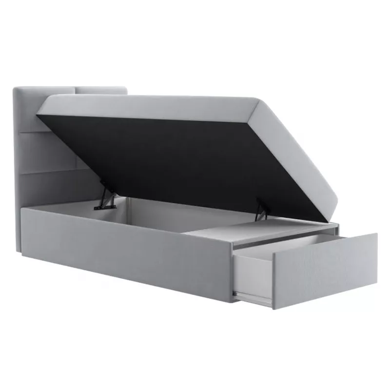 Jednolůžková boxspringová postel s vysokým čelem LUGAU se vyznačuje pohodlím, praktičností a důrazem na detail. Postel o spací ploše 90x200 cm tvoří komfortní taštičková matrace a horní topper pro maximální pocit pohodlí. Výklopný úložný prostor na lůžkoviny doplňuje praktický výsuvný šuplík.