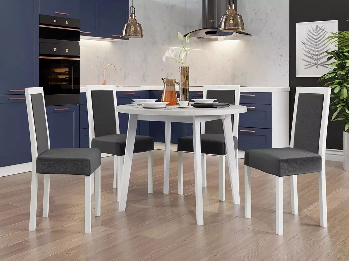 Sestava do jídelny SALUSIA vytváří ideální prostor pro rodinná setkání a společenské chvíle. Kulatý stůl s jedinečnou povrchovou úpravou dodává místnosti charakter a vybízí k pohodlné konverzaci. Čalouněné židle zajistí komfort při každodenním stolování, navíc snadno zapadají do různých stylů interiéru, od klasického po rustikální.
