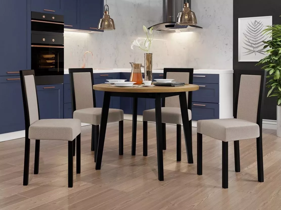 Sestava do jídelny SALUSIA vytváří ideální prostor pro rodinná setkání a společenské chvíle. Kulatý stůl s jedinečnou povrchovou úpravou dodává místnosti charakter a vybízí k pohodlné konverzaci. Čalouněné židle zajistí komfort při každodenním stolování, navíc snadno zapadají do různých stylů interiéru, od klasického po rustikální.