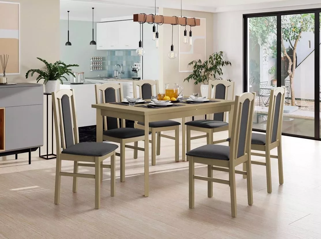 Zajistěte si pohodlí při každodenním stolování s jídelní sestavou SALUSIA. Stůl s pevnou konstrukcí lze snadno rozložit na šířku 180 cm, čímž vytvoří dostatek prostoru pro až 6 osob. Sestava obsahuje 6 židlí s pohodlným sedákem a opěradlem, které zajišťují maximální komfort při dlouhých společenských setkáních.
