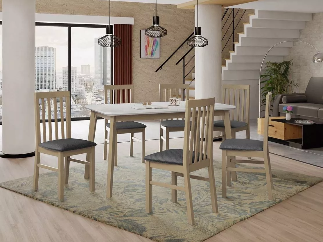 Dopřejte si jídelní prostor, kde se budete cítit skvěle. Pohodlné židle s pěnovým sedákem zajistí maximální komfort, zatímco rozkládací stůl je vždy připraven i na nečekané návštěvy. Masivní konstrukce nábytku zajistí odolnost na dlouhá léta.