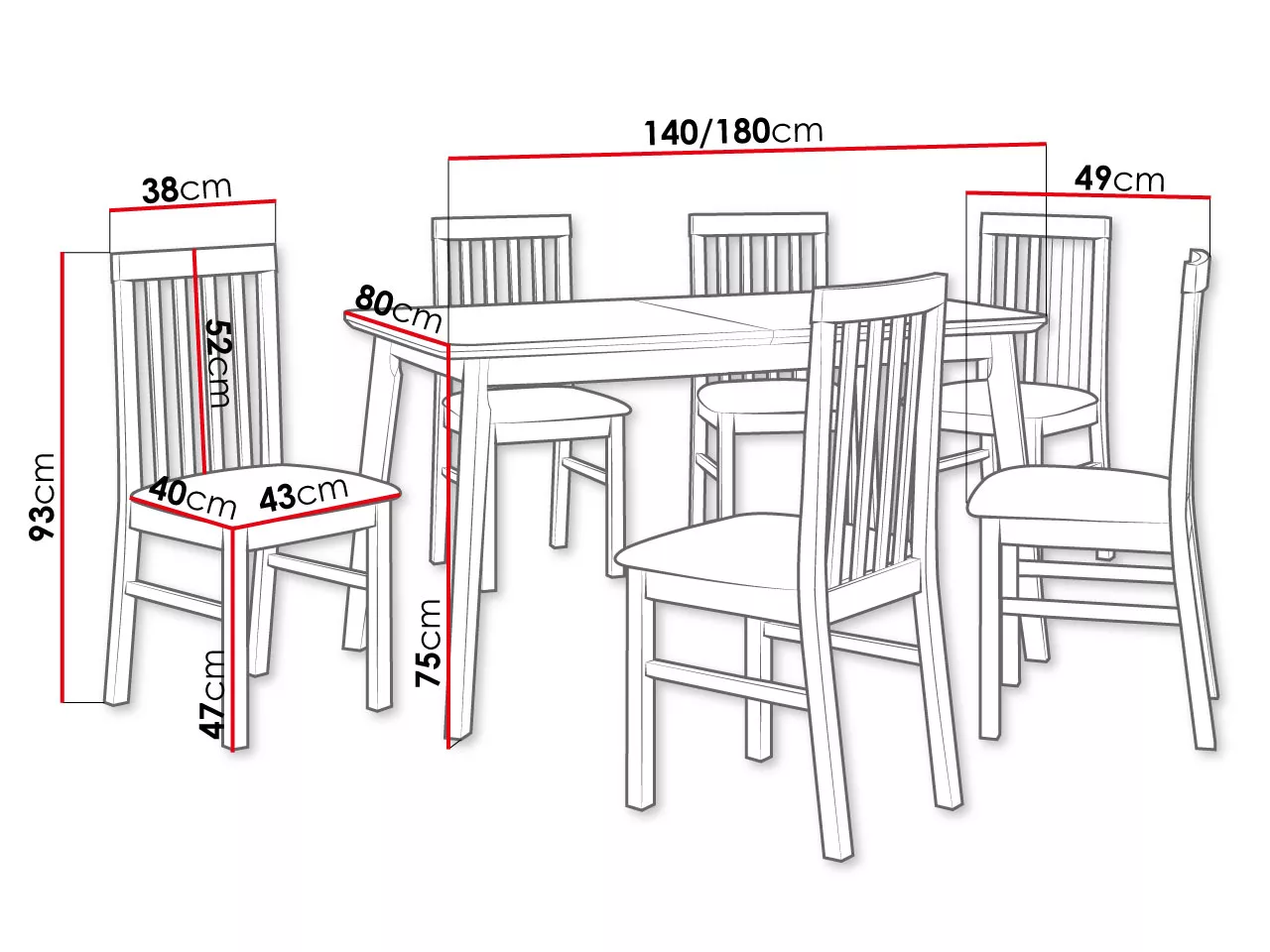 - 6x jídelní židle: 43/93/40 cm