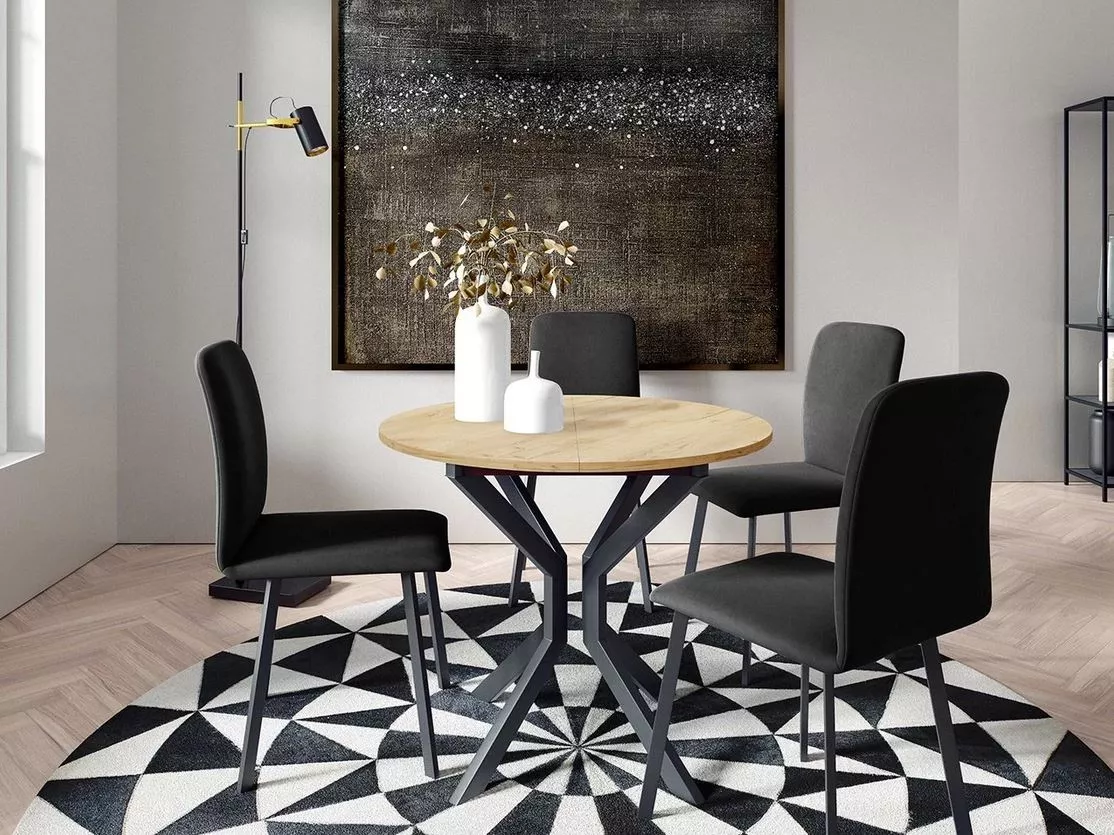 Jídelní sestava SALPA – spojení funkčnosti, elegance a pohodlí. Rozkládací kulatý stůl snadno přizpůsobíte aktuálním potřebám, zatímco kovové nohy zajistí stabilitu i při každodenním používání. Jídelní židle vynikají pohodlím díky kvalitní pěně v sedáku i opěradle, které je navíc ergonomicky tvarované pro optimální podporu zad. Minimalistický, ale zároveň nadčasový design skvěle doplní skandinávský i moderní styl vašeho domova.