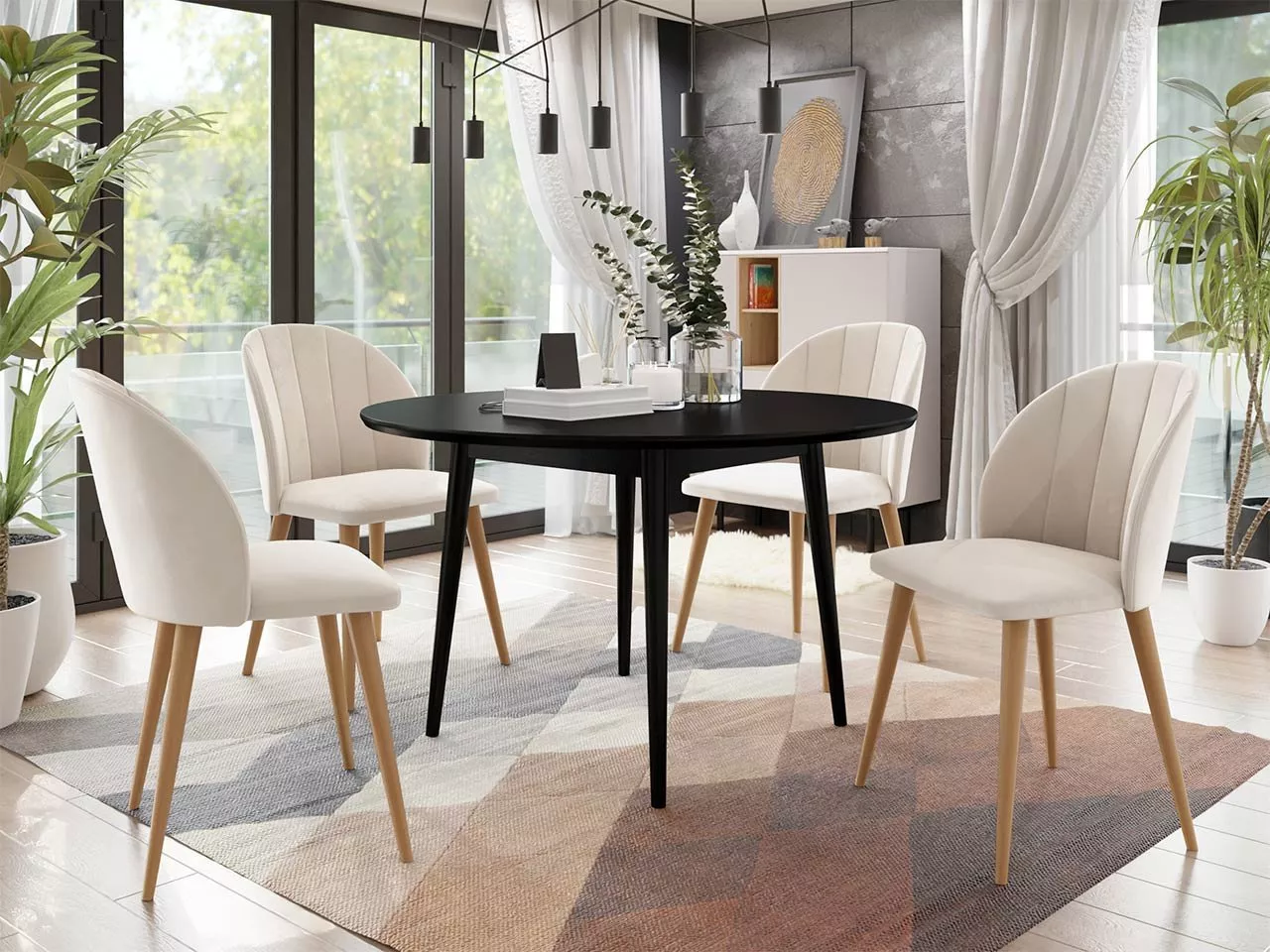 Jídelní sestavu NOWEN 1 tvoří kulatý stůl o průměru 120 cm a 4 elegantní židle s měkkým polstrováním. Masivní bukové nohy podtrhují skandinávský styl nábytku a postarají se o dostatečnou stabilitu.