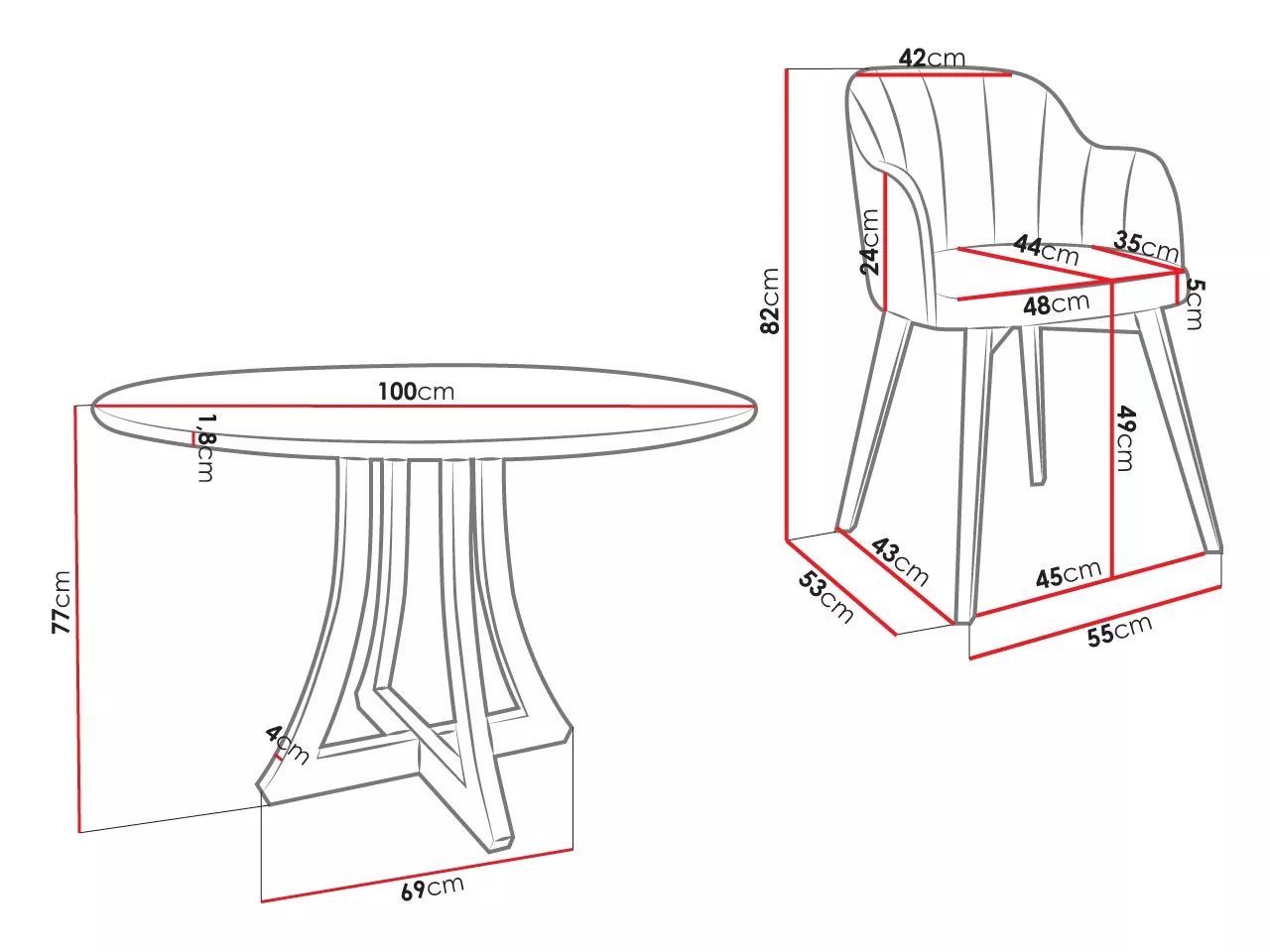 Kulatý jídelní stůl se 4 židlemi TULZA 2 dokonale zapadá do moderního vybavení jídelny. Předností stolu s průměrem 100 cm jsou ozdobné nohy, které zajišťují stabilitu a funkčnost. Charakteristickými znaky jídelních židlí jsou zkosené nohy, zaoblené prošívané opěradlo a odolný potah.