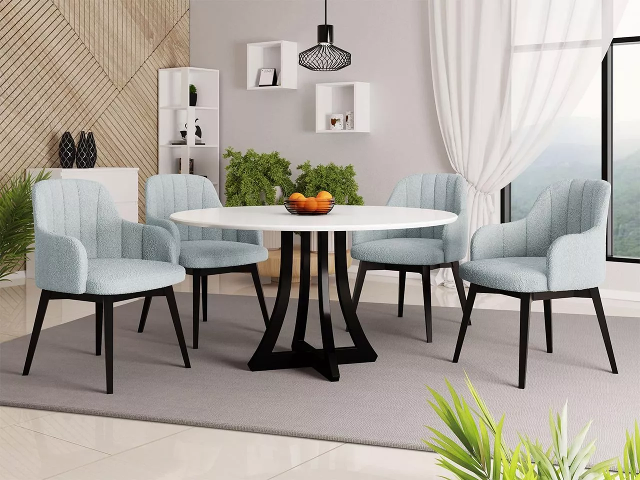 Kulatý jídelní stůl 120 cm se 4 židlemi TULZA 2 - lesklý černobílý / modrý