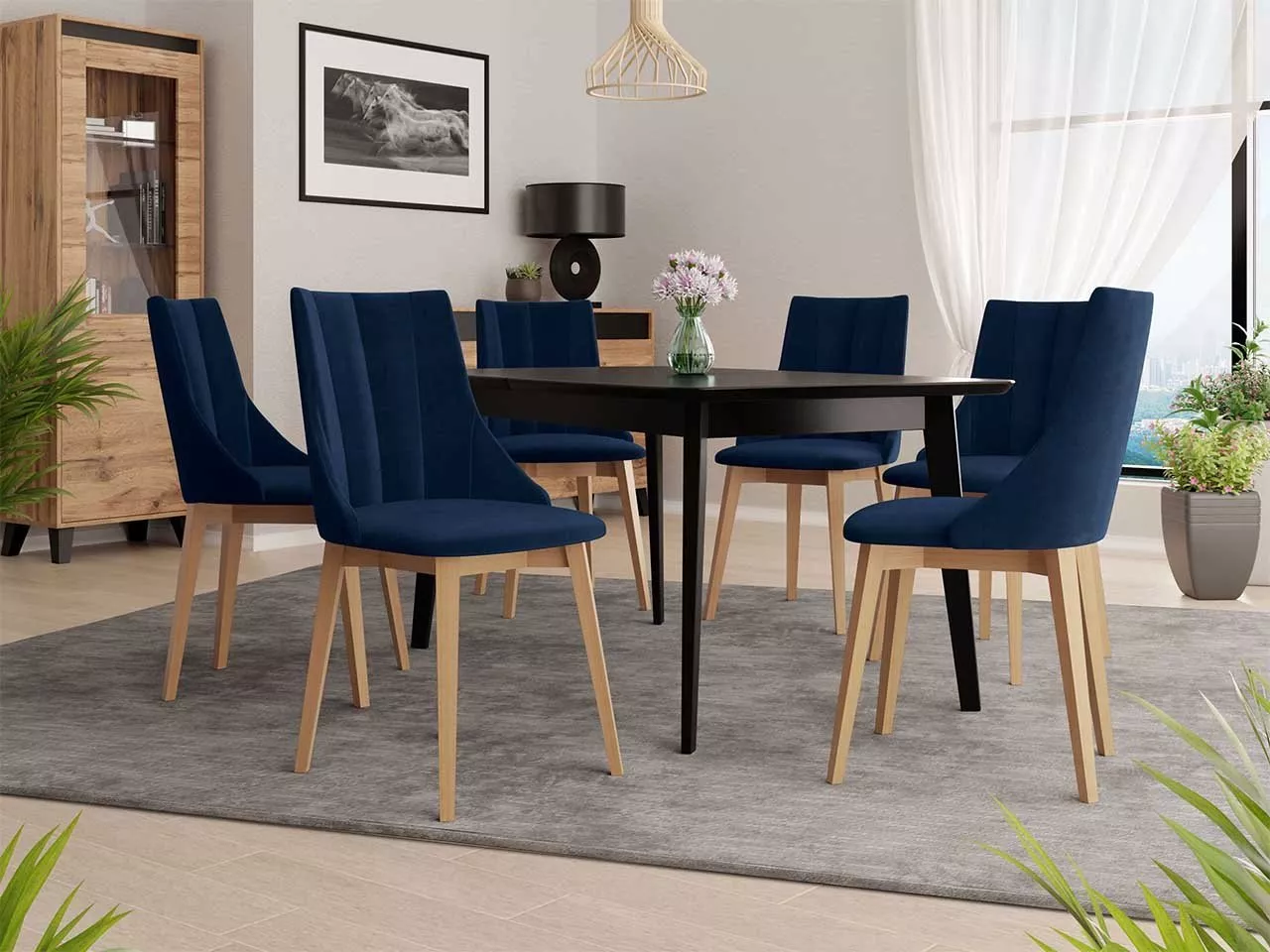 Rozkládací jídelní stůl se 6 židlemi NOWEN 2 - černý / přírodní dřevo / modrý