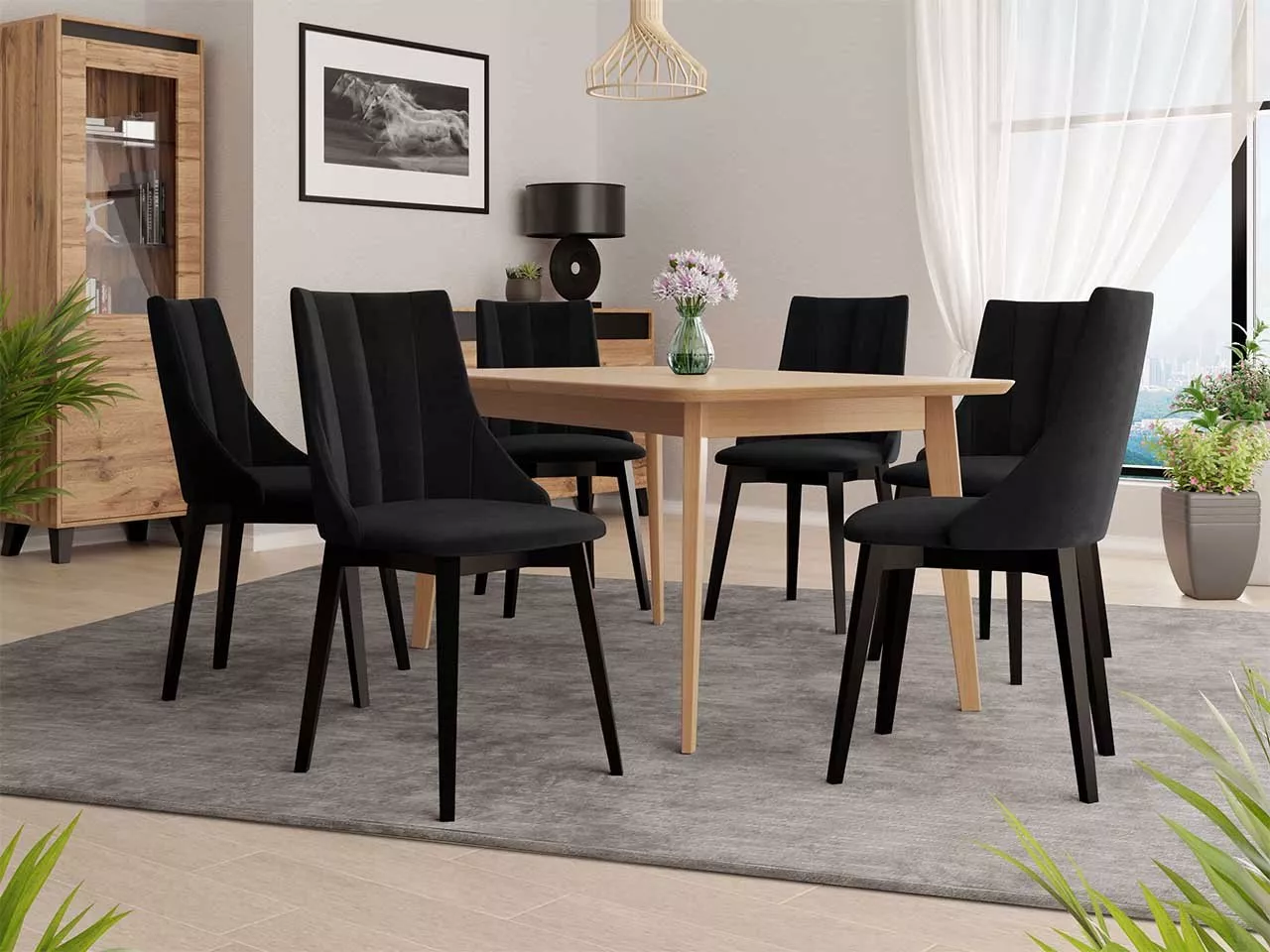 Rozkládací jídelní stůl se 6 židlemi NOWEN 2 - přírodní dřevo / černý 2