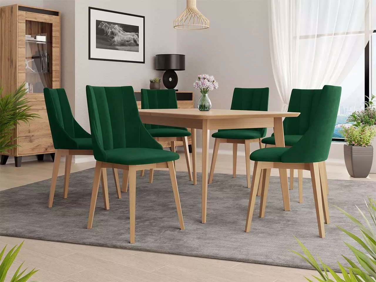 Rozkládací jídelní stůl se 6 židlemi NOWEN 2 - přírodní dřevo / zelený