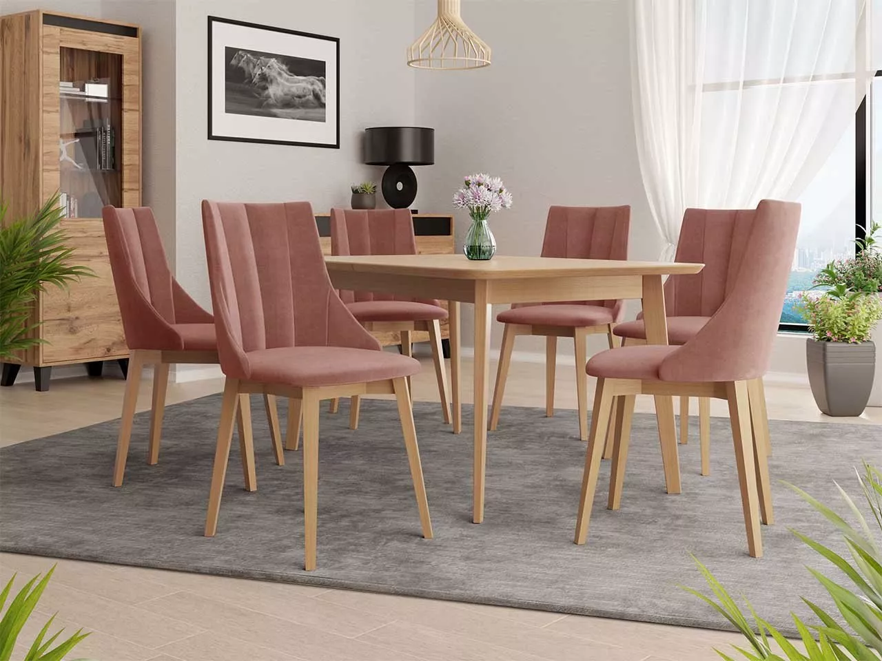 Rozkládací jídelní stůl se 6 židlemi NOWEN 2 - přírodní dřevo / růžový
