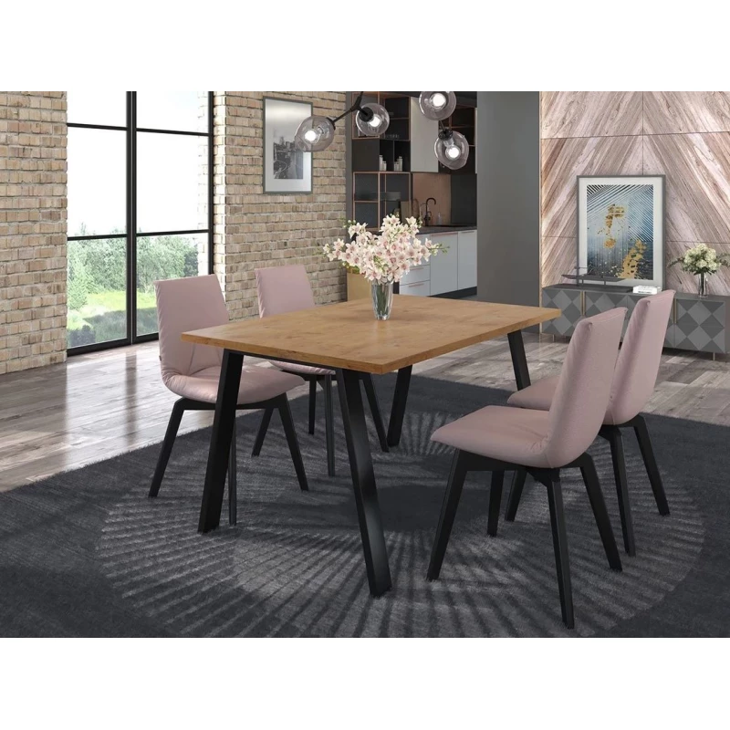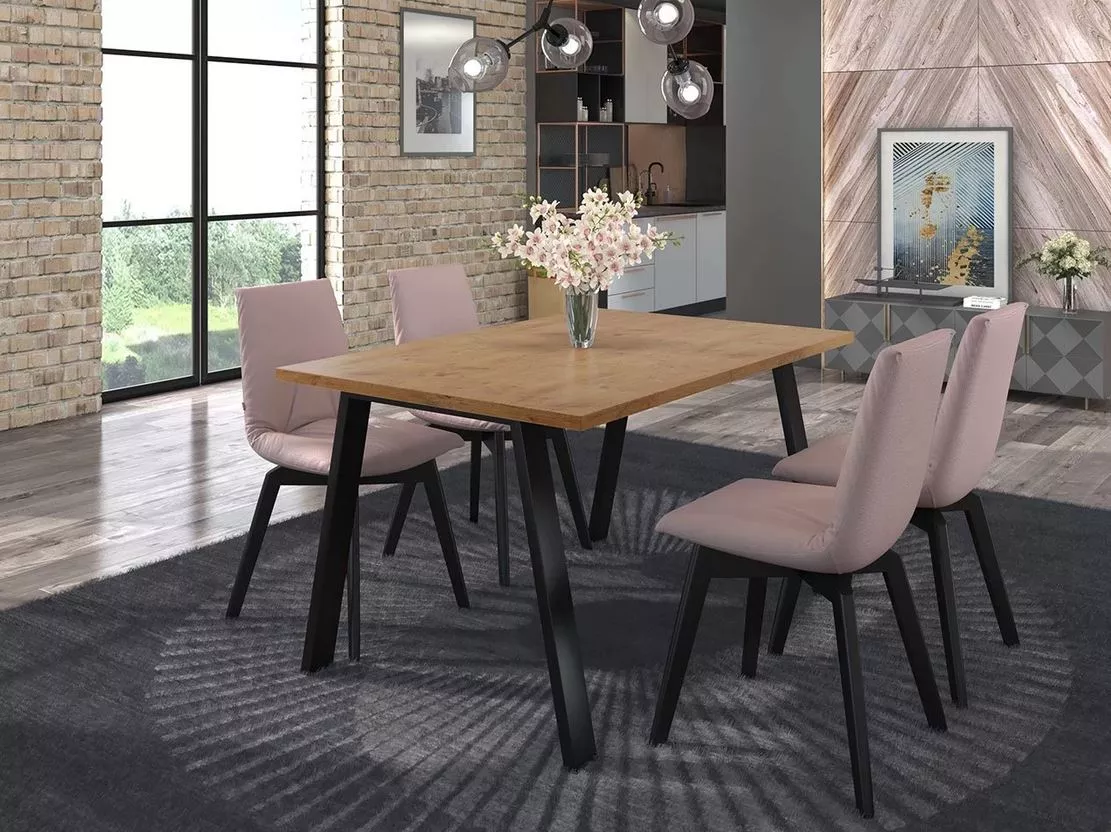 Stůl do jídelny KOCIO je odpovědí na současné trendy interiérového designu, které se zaměřují na syrové akcenty v podobě struktury dřeva nebo kovu. Kovové nohy jsou umístěny šikmo, což zajišťuje perfektní stabilitu.