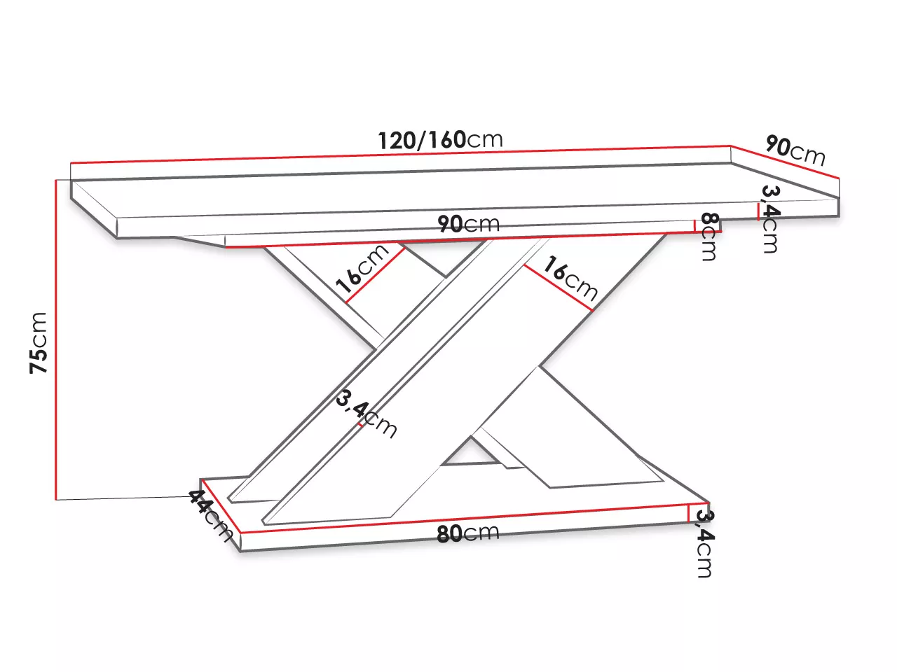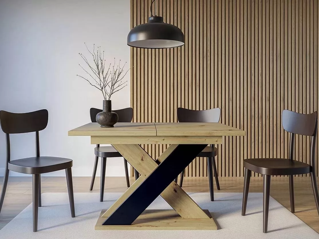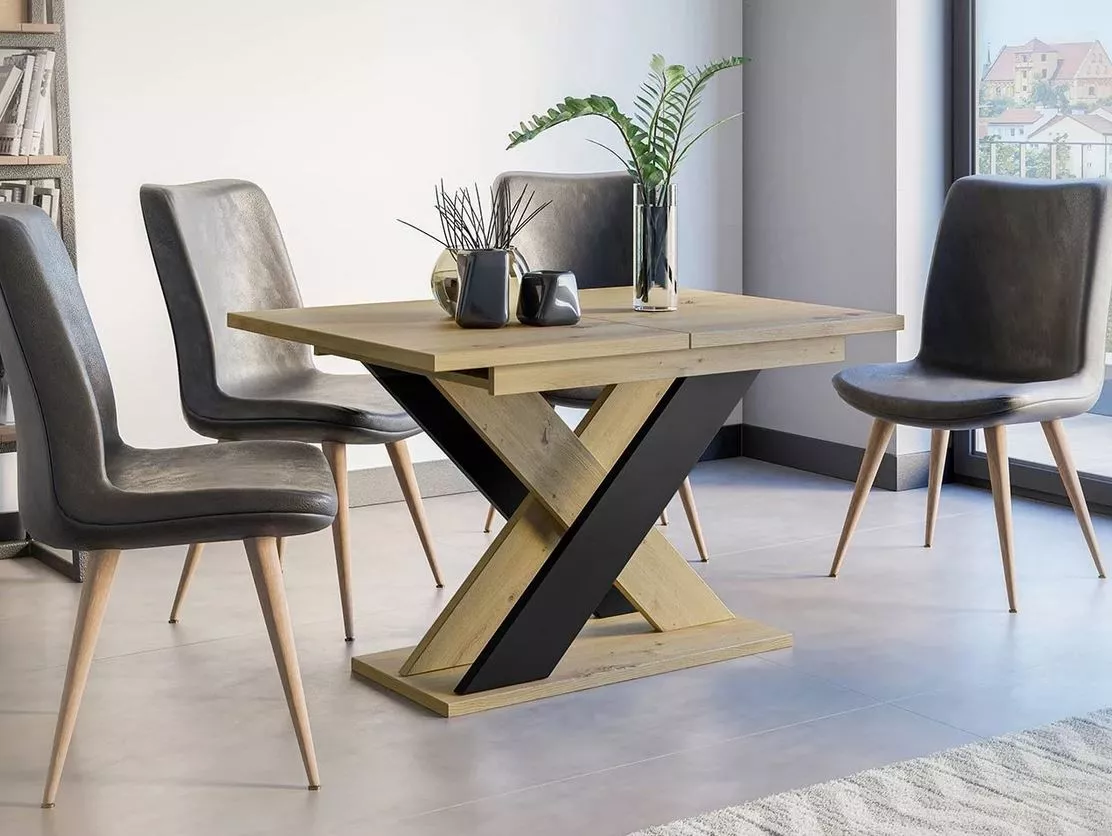 Působivý stůl do jídelny v designovém stylu pro větší estetiku i praktičnost. Elegantní nohy se zužují do tvaru písmene X, což dodává nábytku jedinečný vzhled. Rozložitelný do šířky 160 cm, vhodný pro rodinná setkání až pro 6 osob.