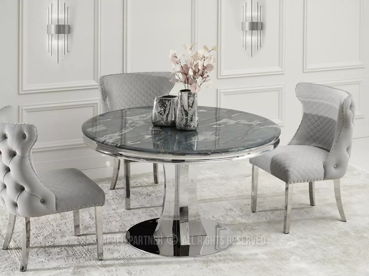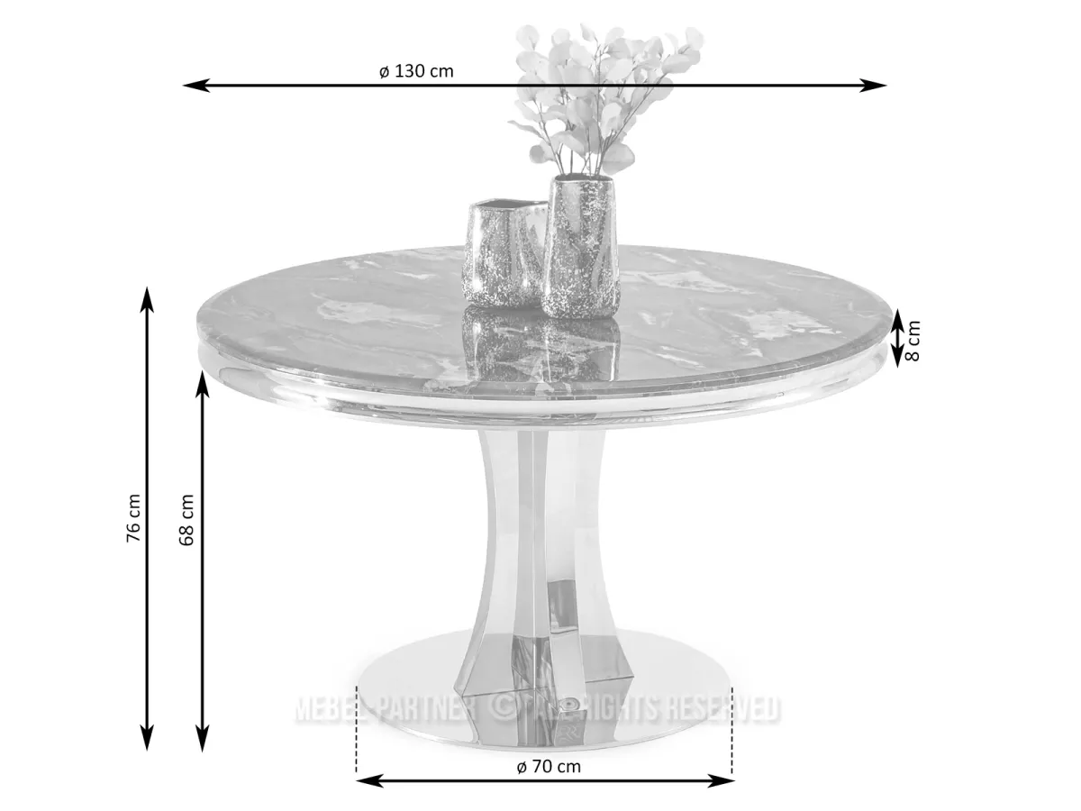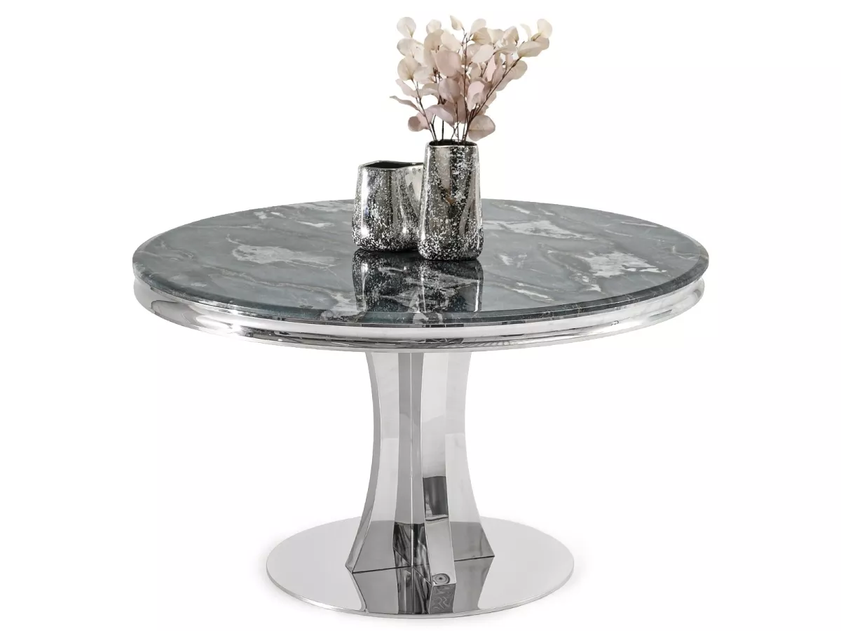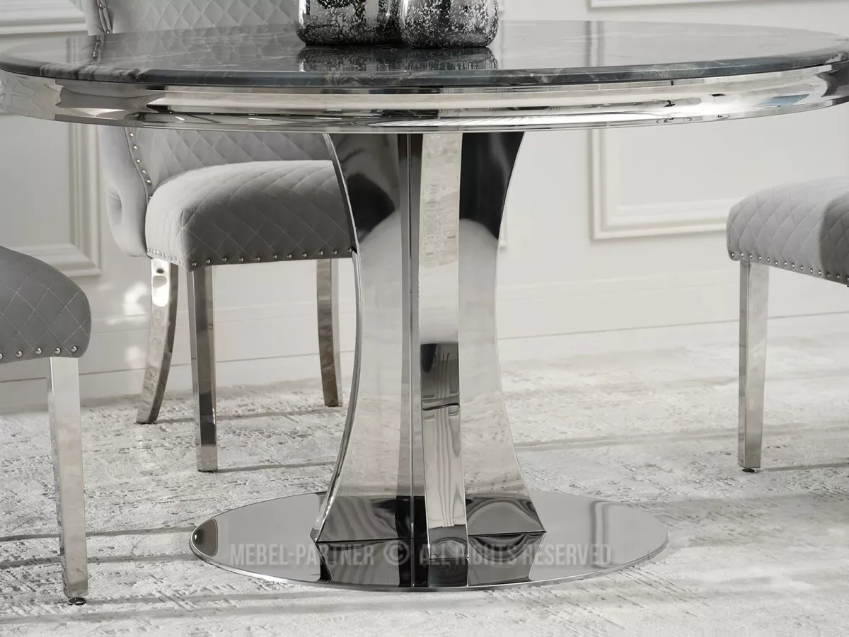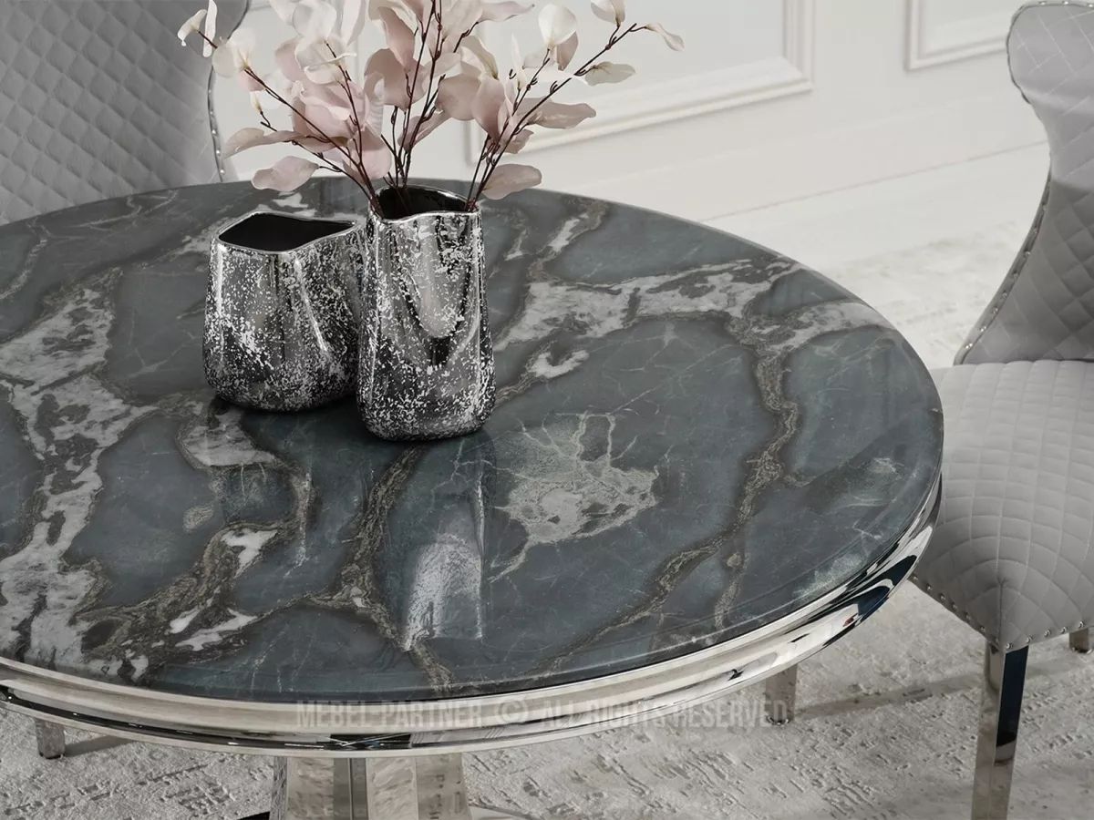 Designový kulatý stůl EBONY jistě na první pohled zaujme horní deskou s dekorem šedomodrého mramoru. Podstava umožňuje díky svému designu pohodlně rozmístit židle kolem stolu, což zvyšuje komfort používání.