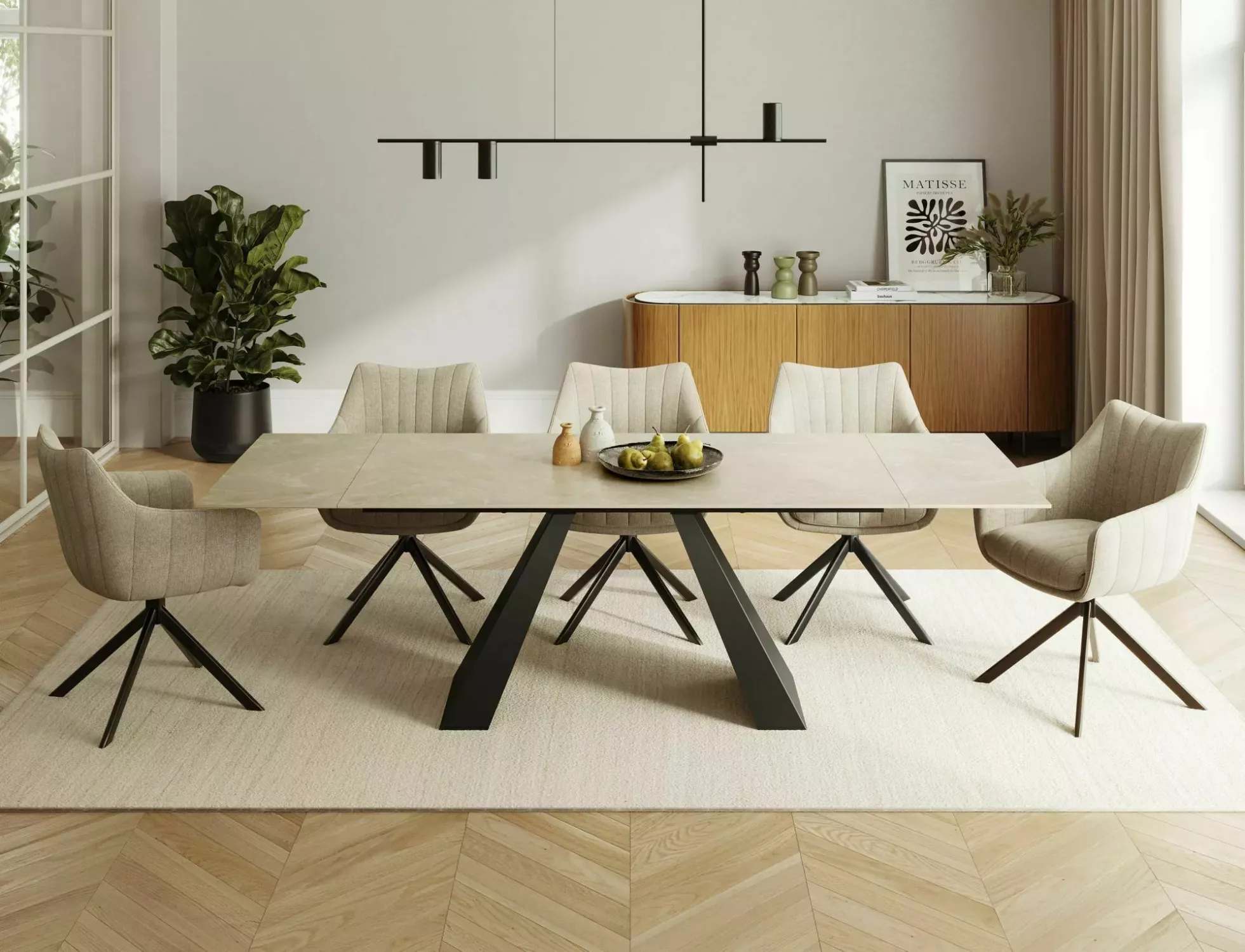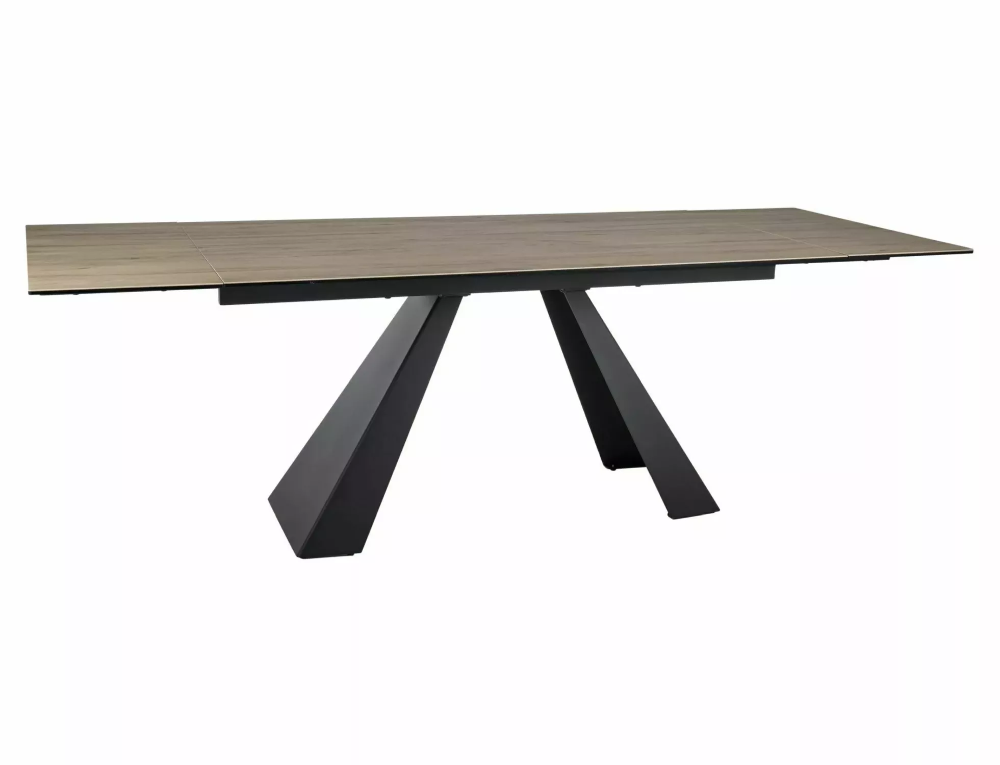 Rozkládací jídelní stůl GEDEON je zajímavou kombinací skla a keramiky, která elegantně imituje dřevo. Nohy mají jednoduchý a moderní tvar, jsou vyrobeny z kovu. Stůl má snadný a pohodlný skládací mechanismus.