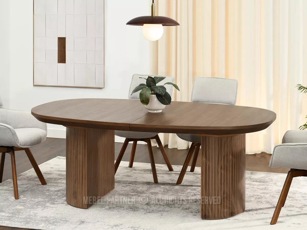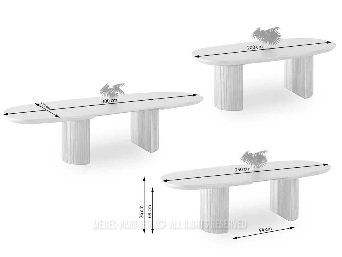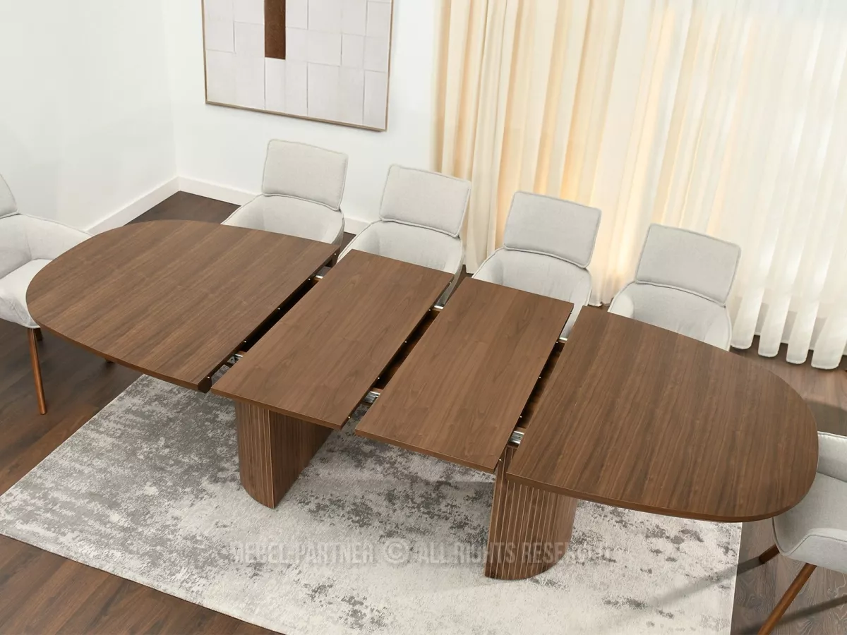 Oválný rozkládací stůl ANTOS je unikátní kombinací moderního designu a praktičnosti. Stůl je vybaven kovovou lištou, která umožňuje snadné vysouvání desek. Stůl je možné rozložit na šířku 250 cm nebo 300 cm.