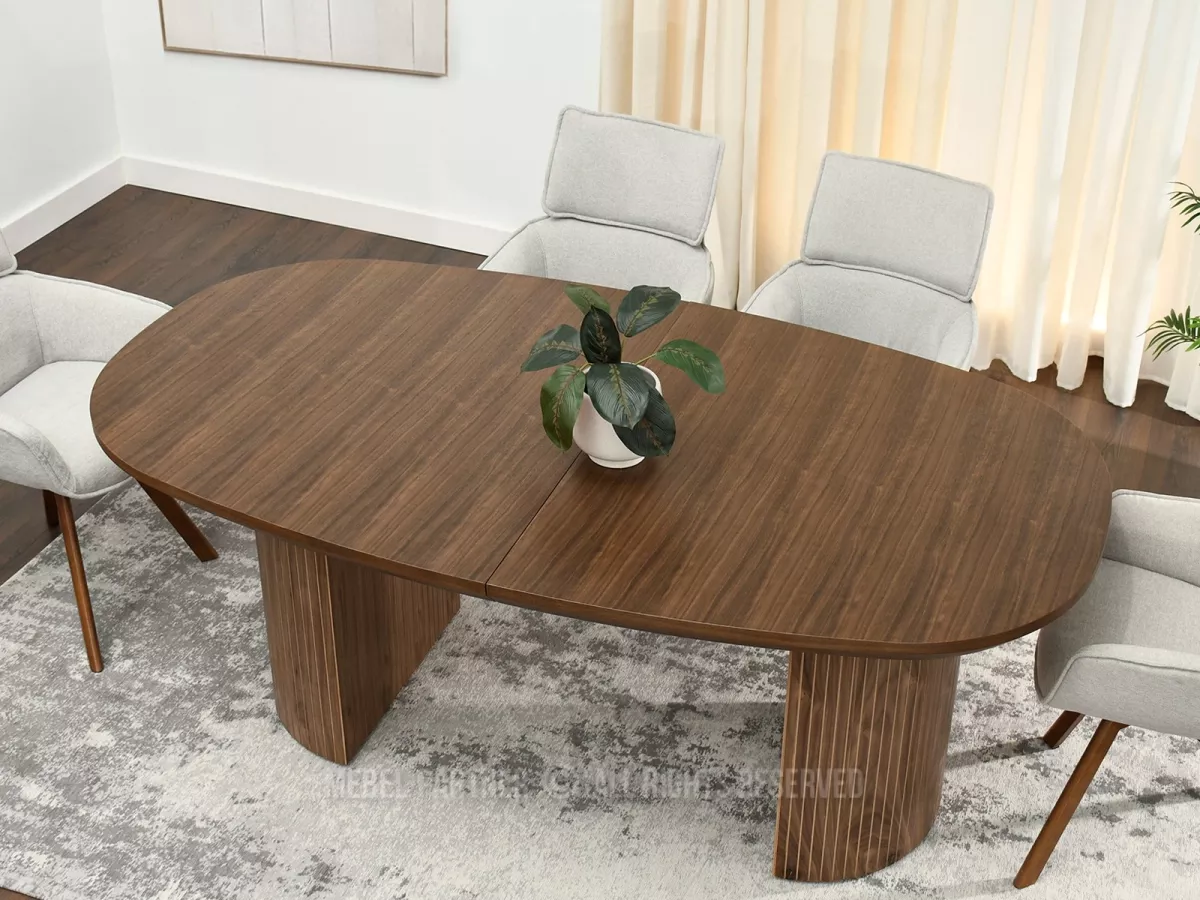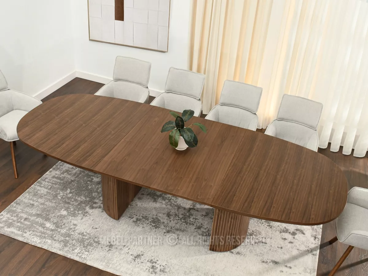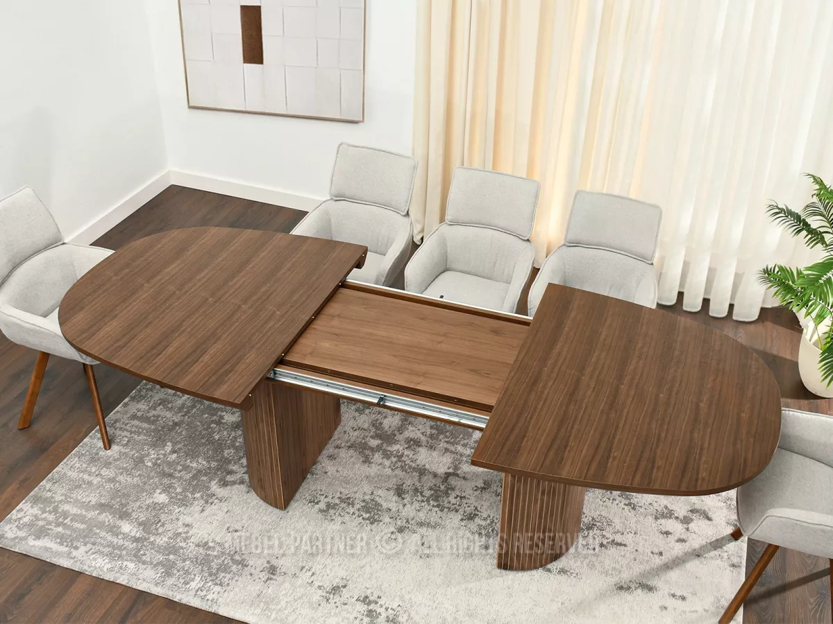Oválný rozkládací stůl ANTOS je unikátní kombinací moderního designu a praktičnosti. Stůl je vybaven kovovou lištou, která umožňuje snadné vysouvání desek. Stůl je možné rozložit na šířku 250 cm nebo 300 cm.