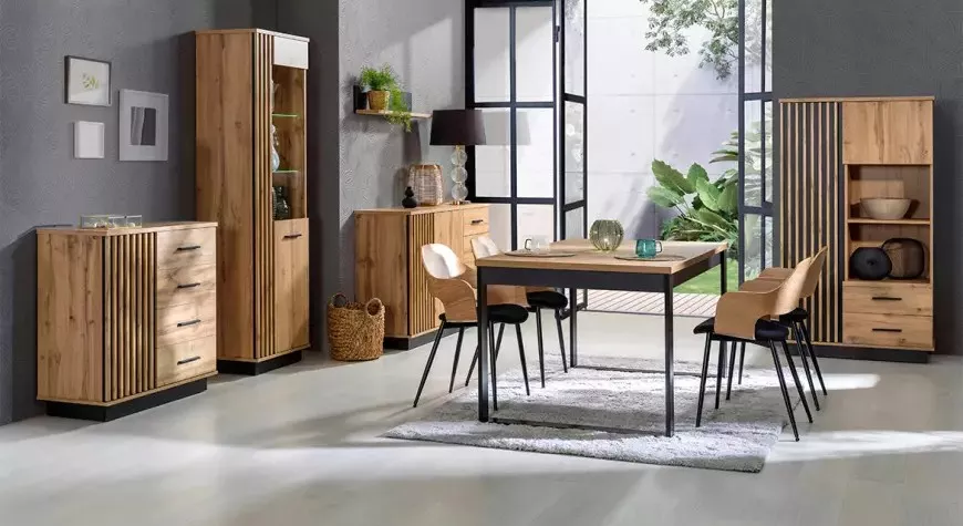 Rozkládací jídelní stůl CATAWBA je ideální pro velká setkání s rodinou i přáteli. Stabilní konstrukce v podobě kovových noh zajišťuje pevnost a odolnost. Jedinečný dekor dubu horní desky dodává stolu elegantní a luxusní charakter.