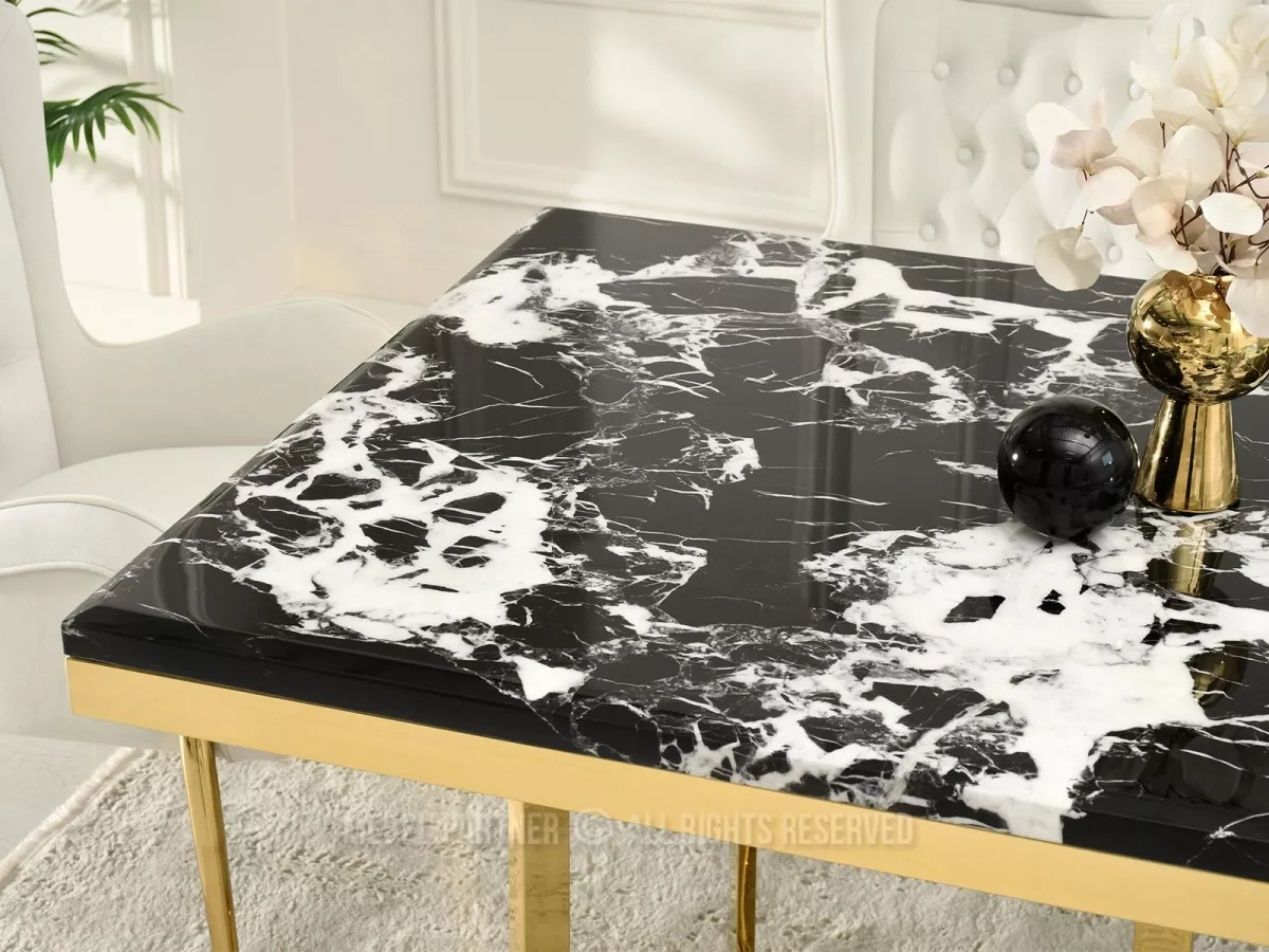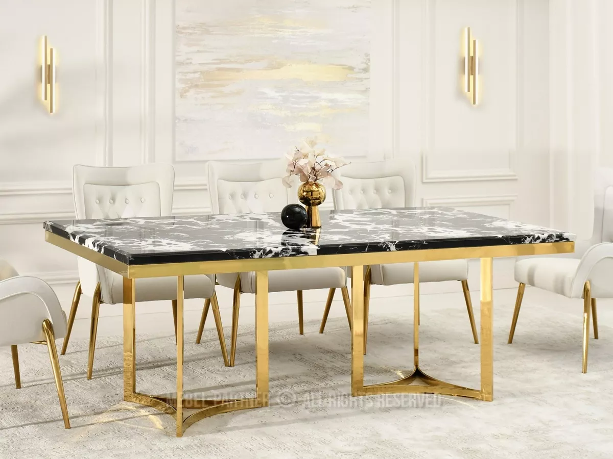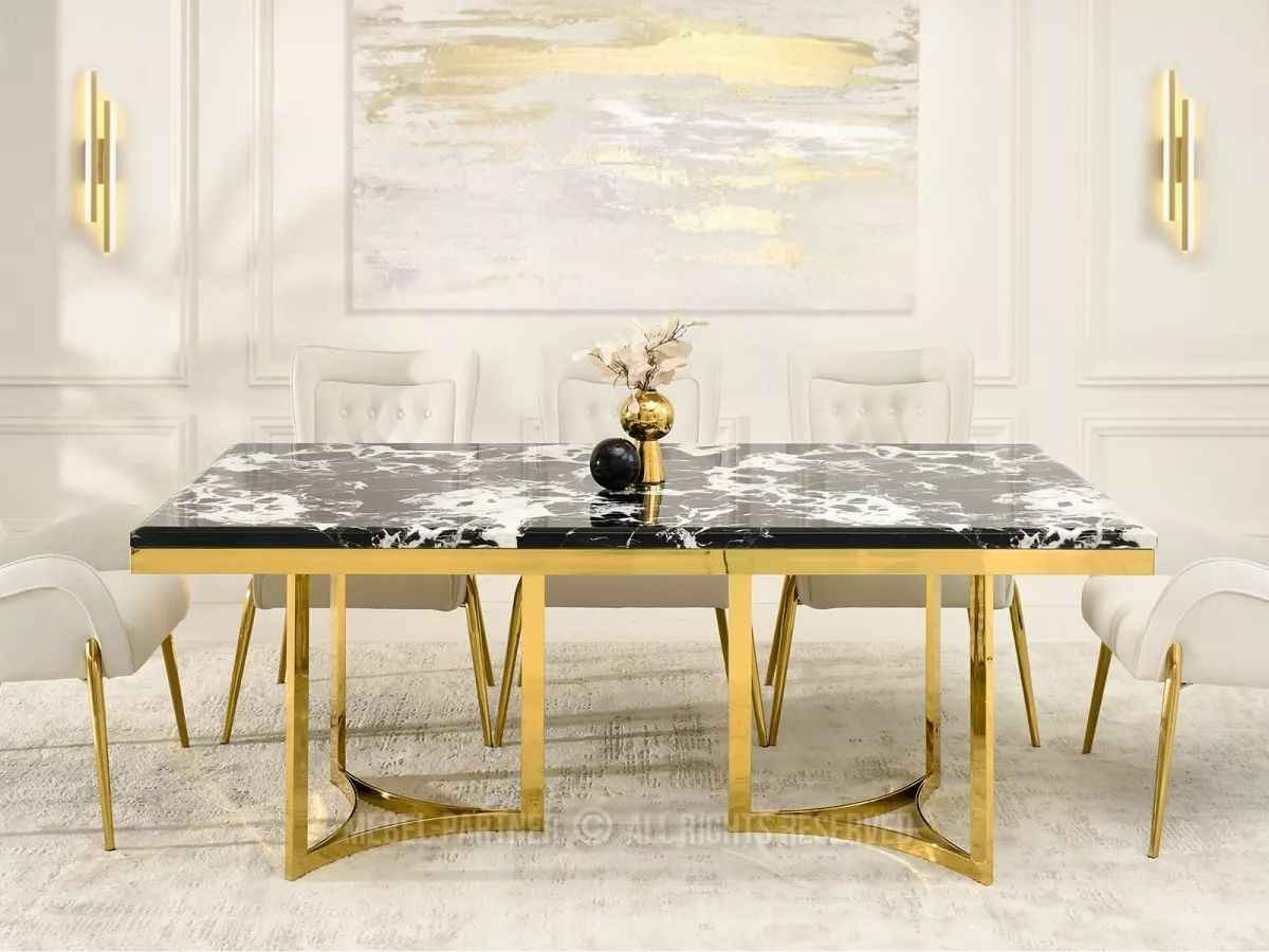 Stylový jídelní stůl FARIS s černou mramorovou deskou a lesklou zlatou konstrukcí se stane dominantou každého interiéru. Ideální pro všechny, kteří chtějí propojit styl, kvalitu a nadčasový vzhled.