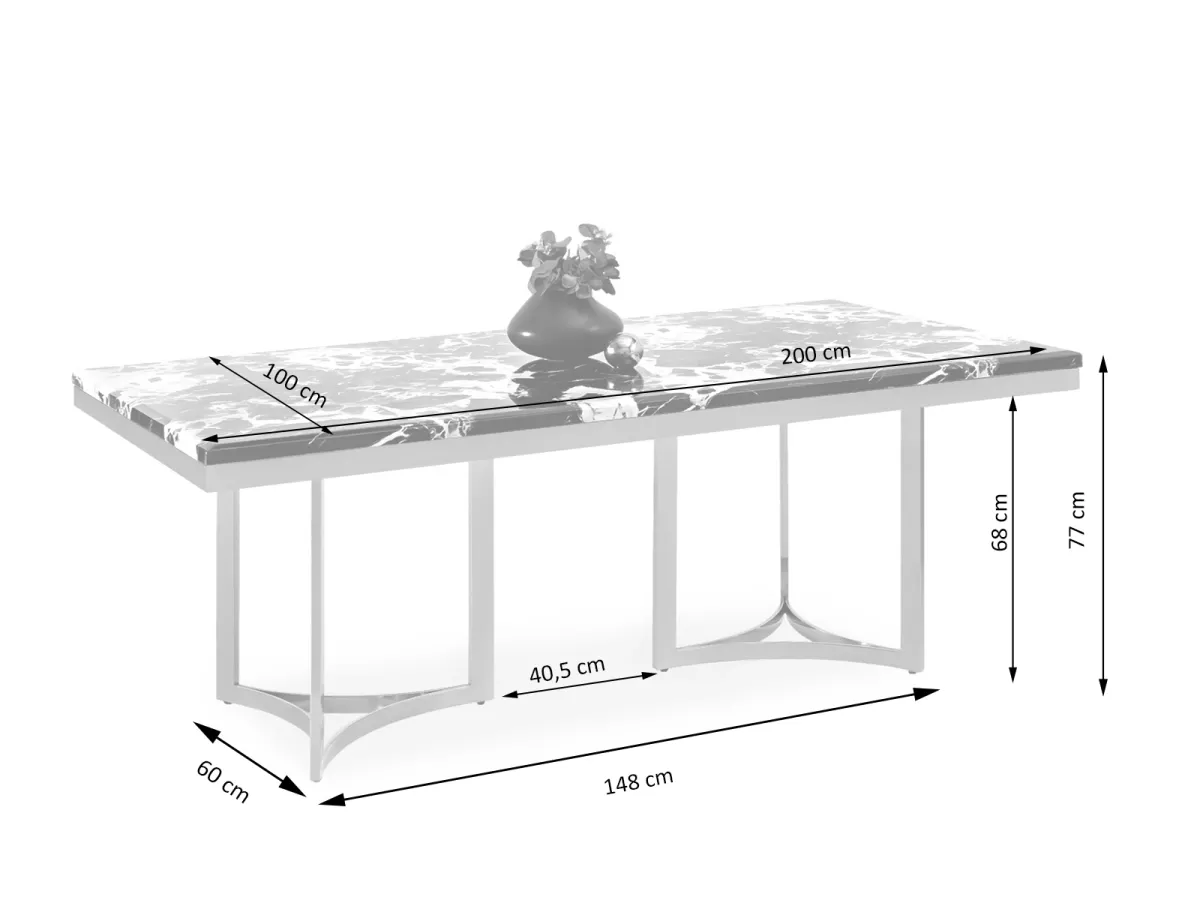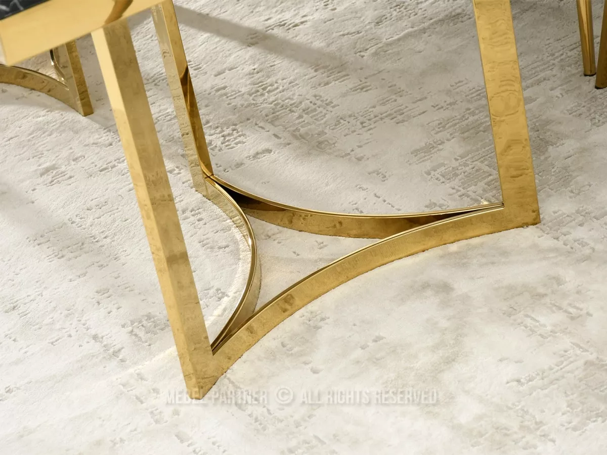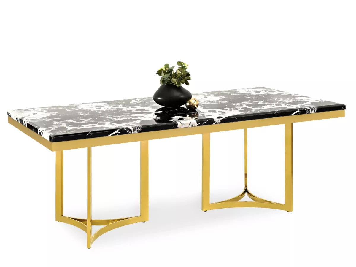 Stylový jídelní stůl FARIS s černou mramorovou deskou a lesklou zlatou konstrukcí se stane dominantou každého interiéru. Ideální pro všechny, kteří chtějí propojit styl, kvalitu a nadčasový vzhled.