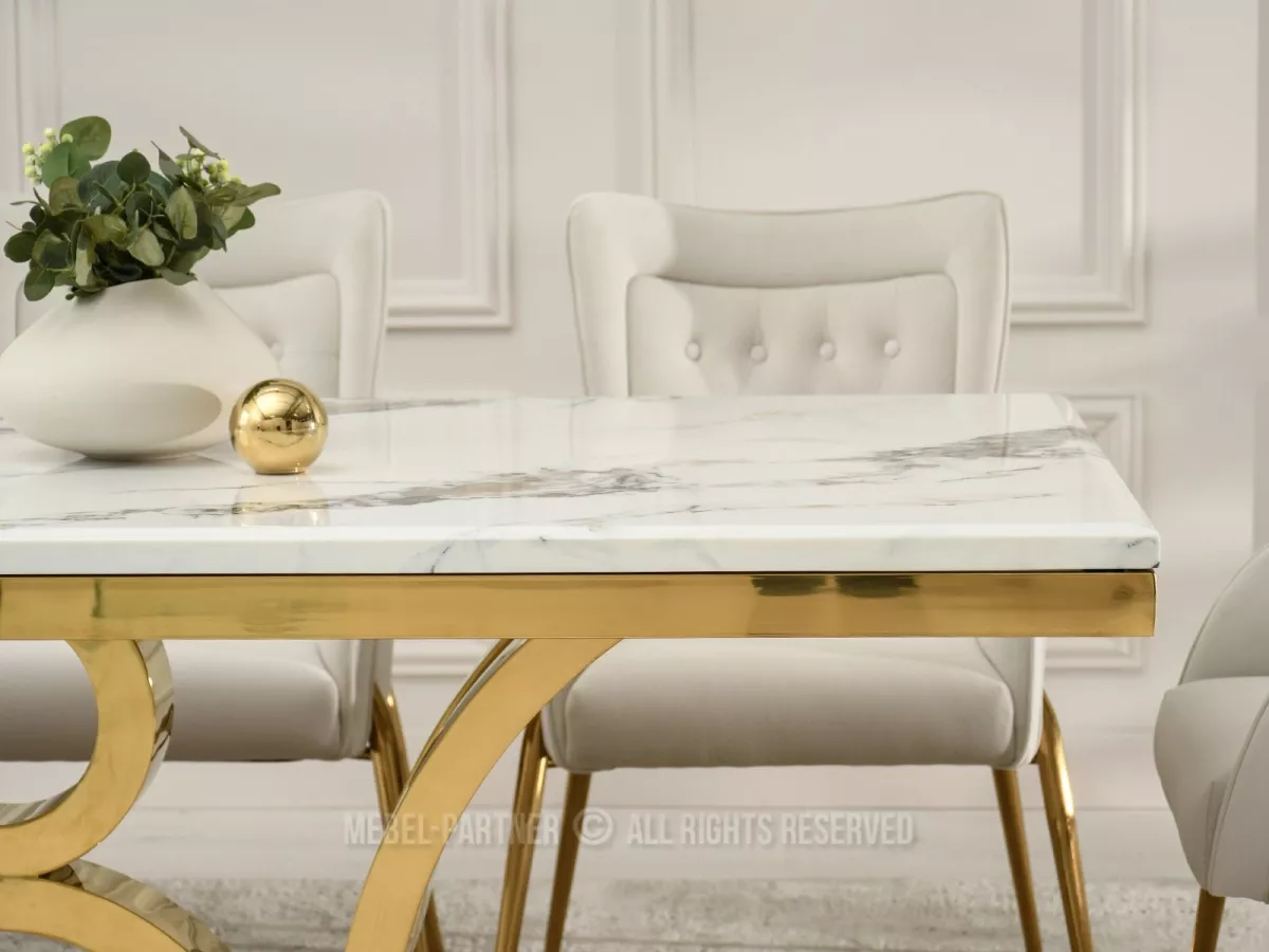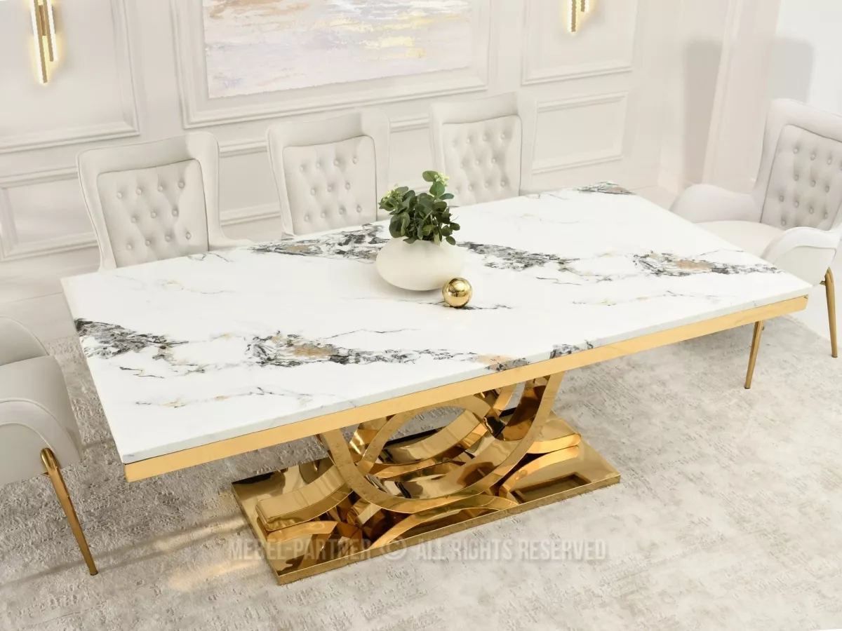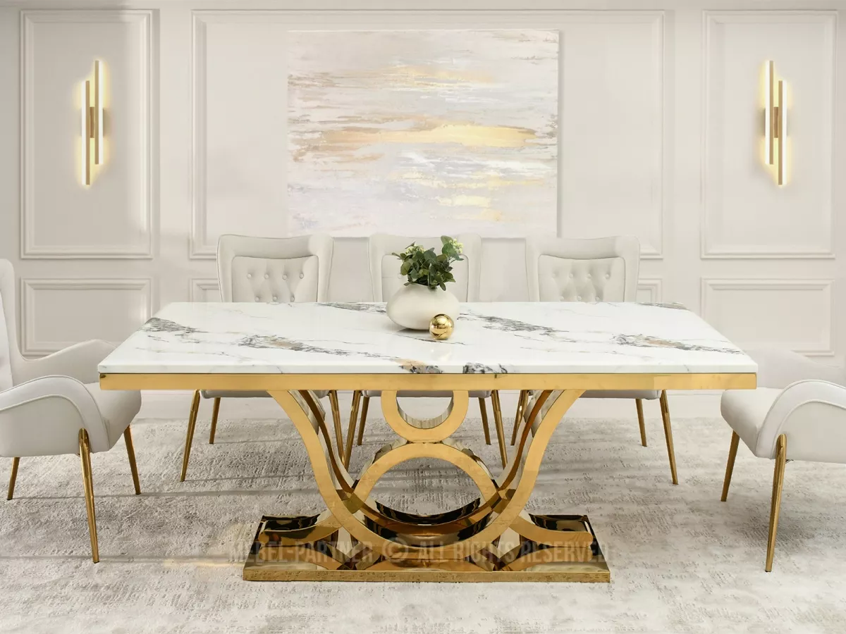 Luxusní jídelní stůl HALIM s mramorovou deskou a zlatou kovovou podstavou vnese do vašeho domova jedinečný styl. Stůl byl vyroben z odolných a pevných materiálů, takže vám bude sloužit mnoho let. Je vhodný až pro 8 osob.