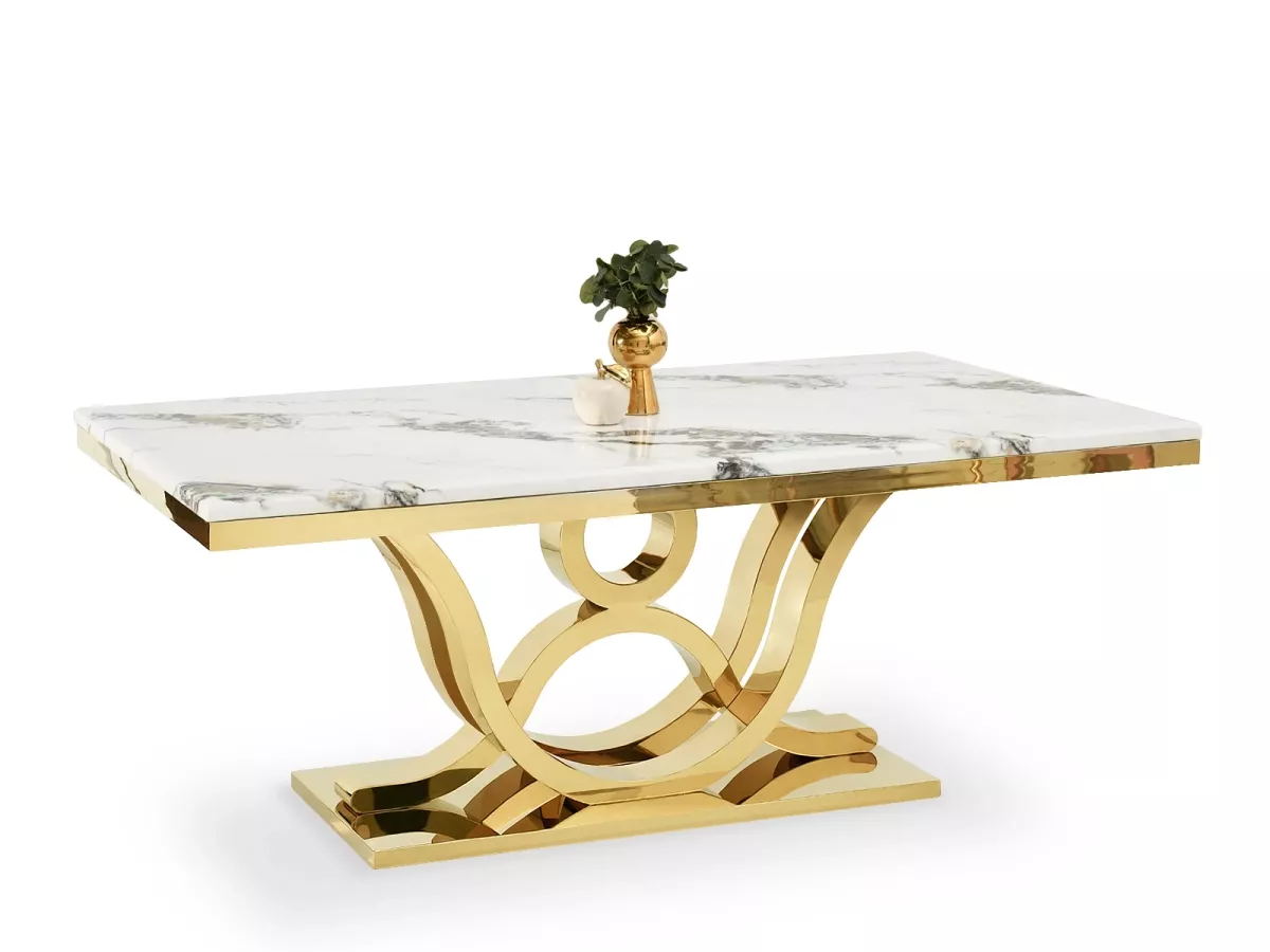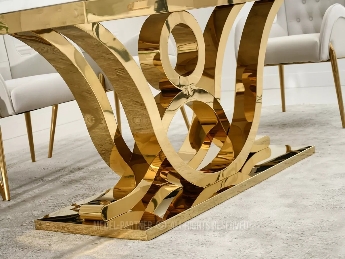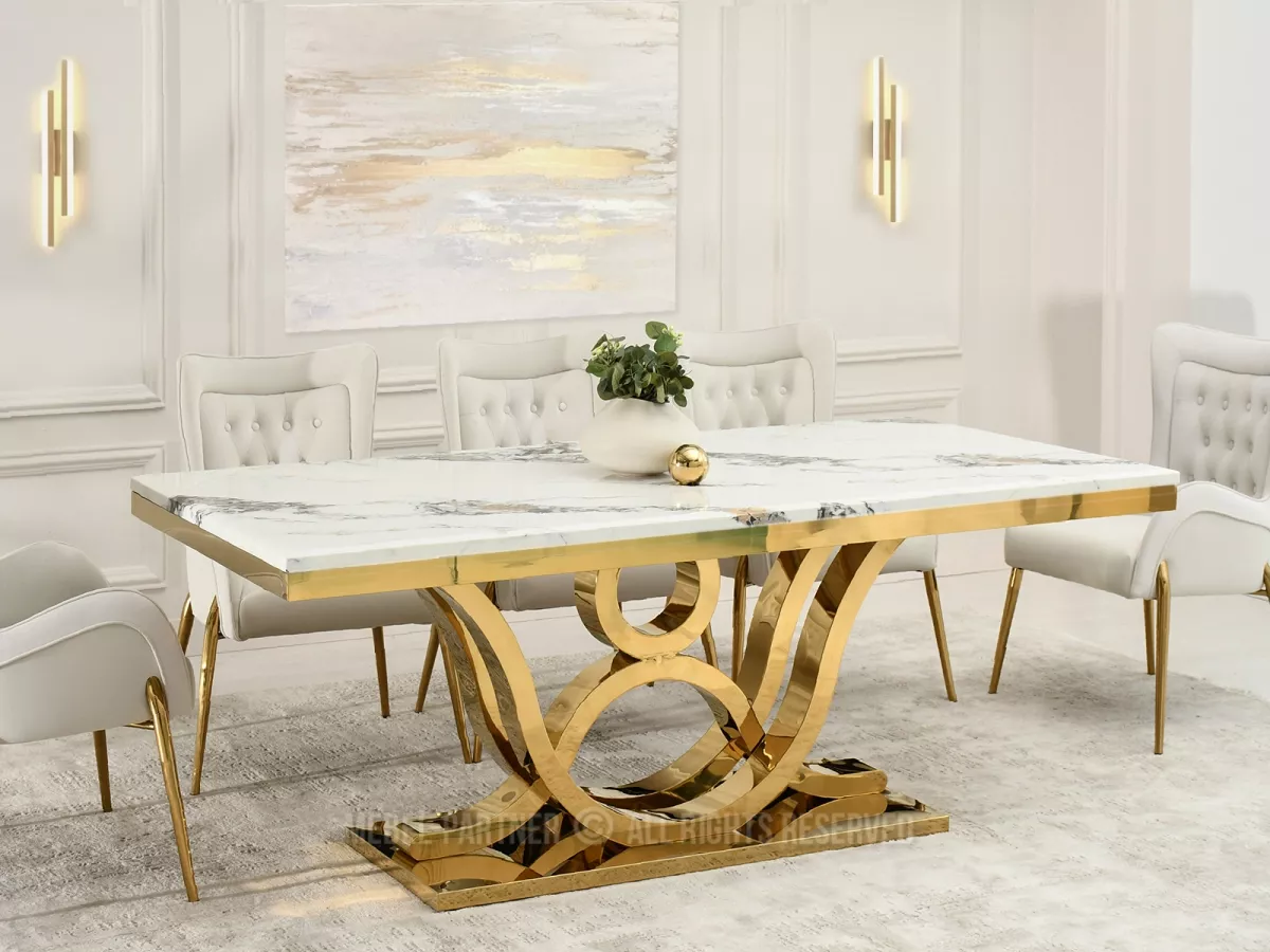 Luxusní jídelní stůl HALIM s mramorovou deskou a zlatou kovovou podstavou vnese do vašeho domova jedinečný styl. Stůl byl vyroben z odolných a pevných materiálů, takže vám bude sloužit mnoho let. Je vhodný až pro 8 osob.