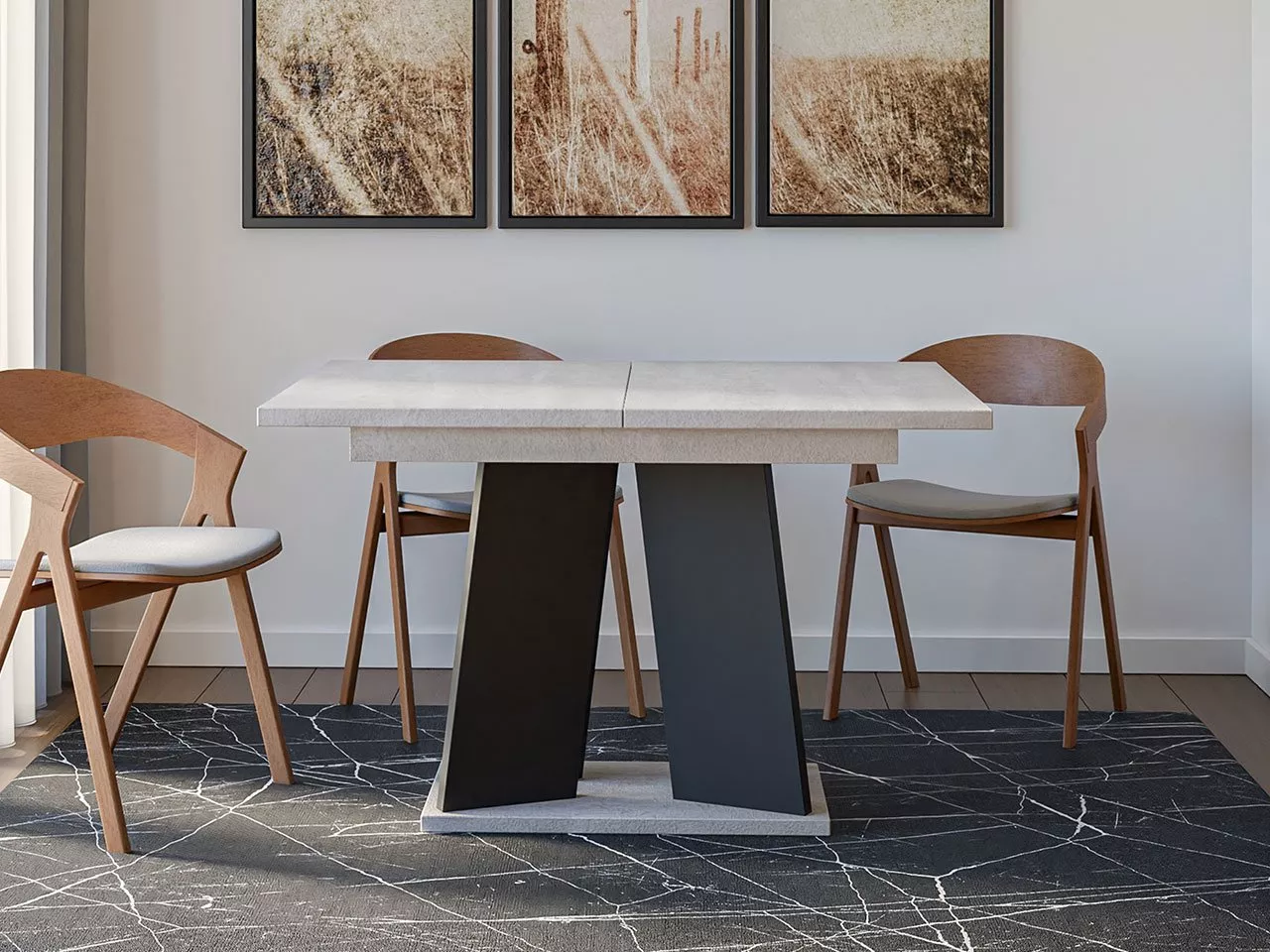Moderní jídelní stůl RANDOY překvapí svým neobvyklým vzhledem. Nespornou výhodou jídelního stolku je možnost rozložení do šířky 160 cm.