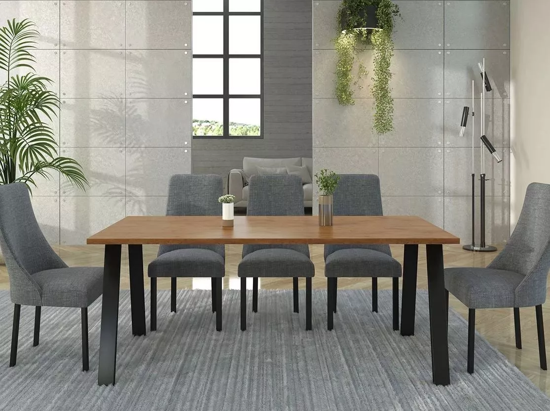 Stůl do jídelny KOCIO je odpovědí na současné trendy interiérového designu, které se zaměřují na syrové akcenty v podobě struktury dřeva nebo kovu. Kovové nohy jsou umístěny šikmo, což zajišťuje perfektní stabilitu.