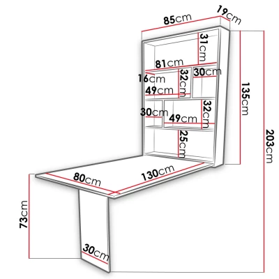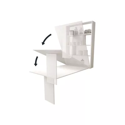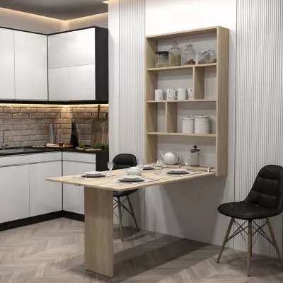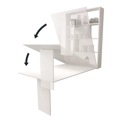 Moderní sklápěcí jídelní stůl OMBO je mimořádným řešením i do menších interiérů. V rozloženém stavu poskytuje úložný prostor v podobě několika prostorných polic. Ve složené podobě vypadá jako závěsná skříň, která poskytuje více prostoru v místnosti.