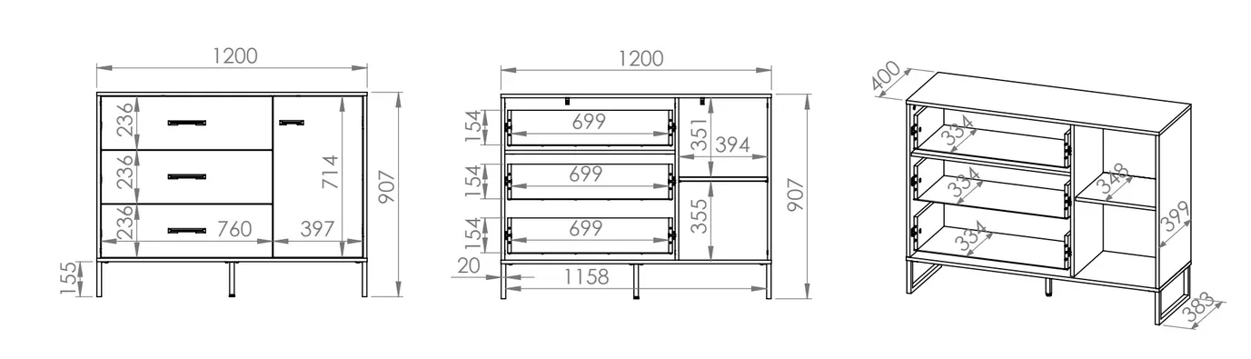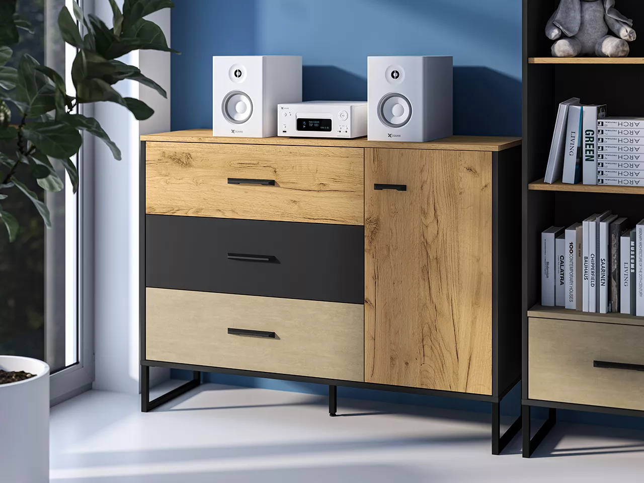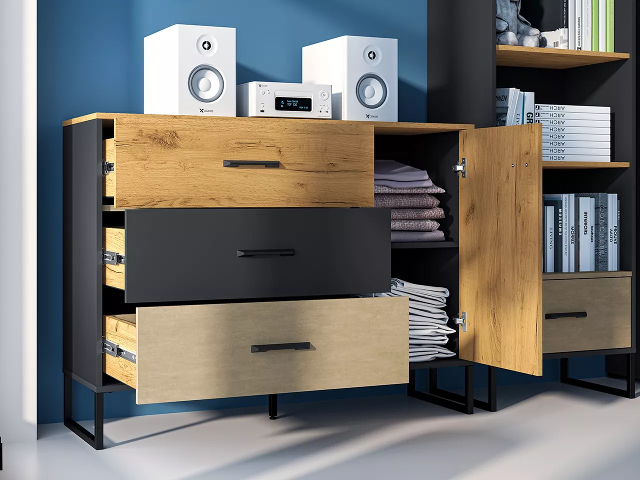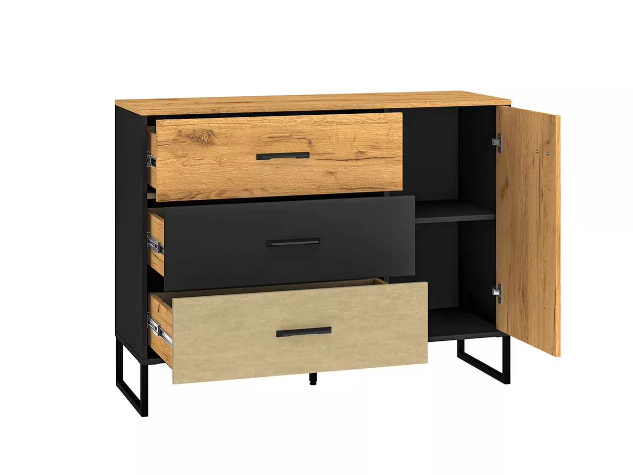 Kombinovaná komoda SABEL se hodí do všech moderních studentských pokojů či ložnic. Komoda se skládá ze 3 šuplíku s plnovýsuvem a zpevněným dnem a z 1 police umístěné za dvířky.