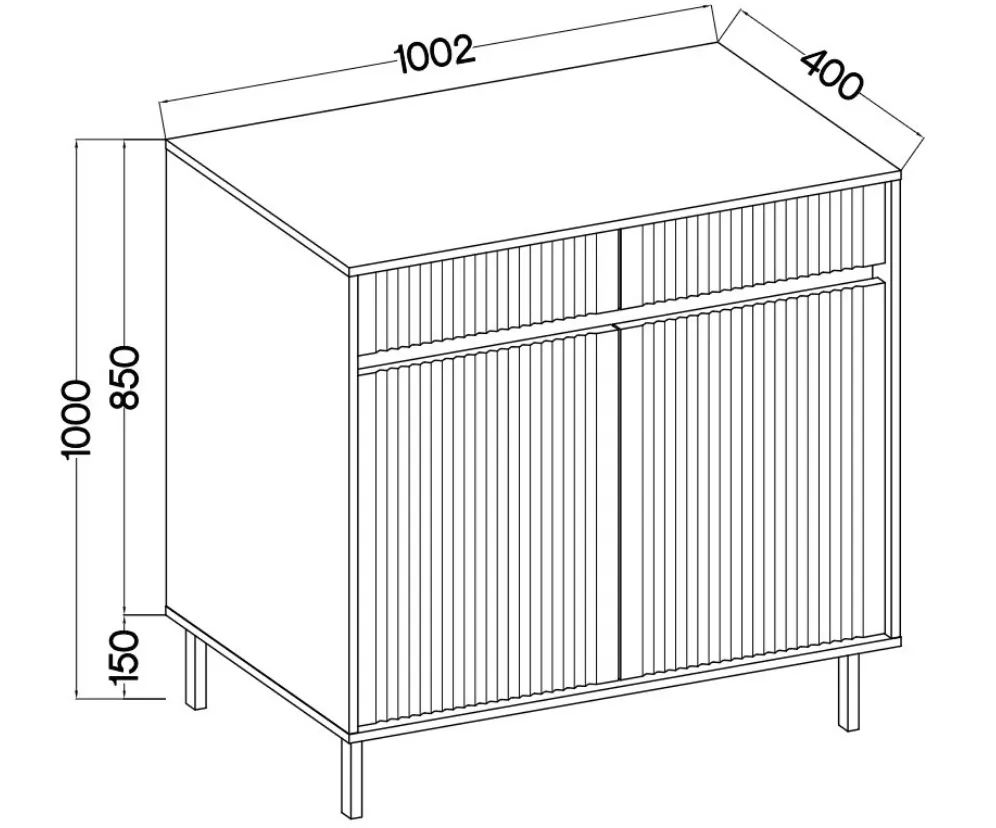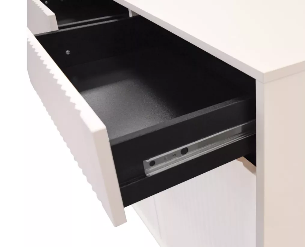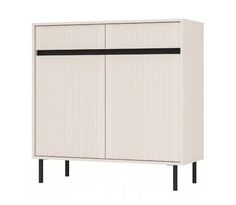 Kombinovaná komoda TIRIL zaujme 3D dvířky. Součástí komody jsou 2 poličky a 2 šuplíky na kuličkových pojezdech.