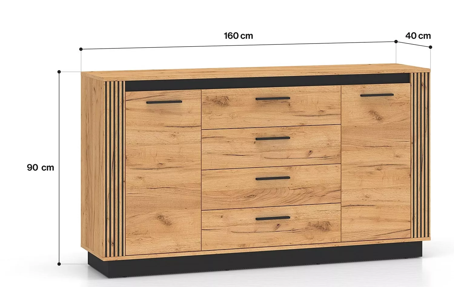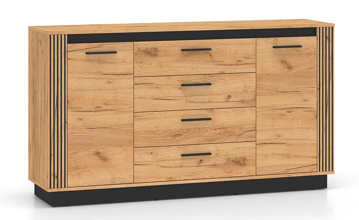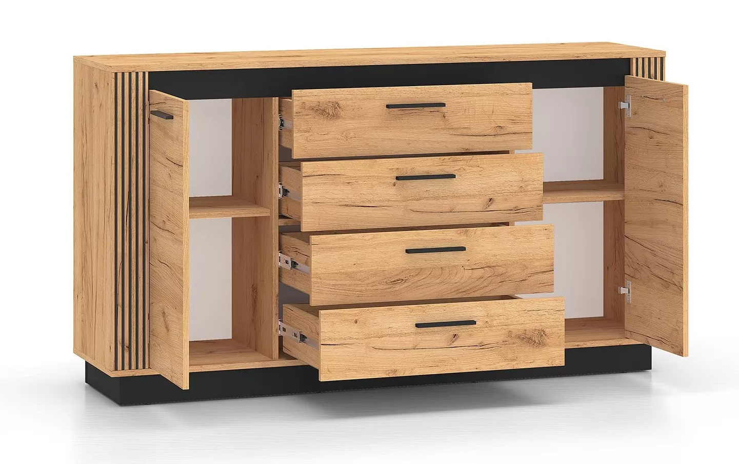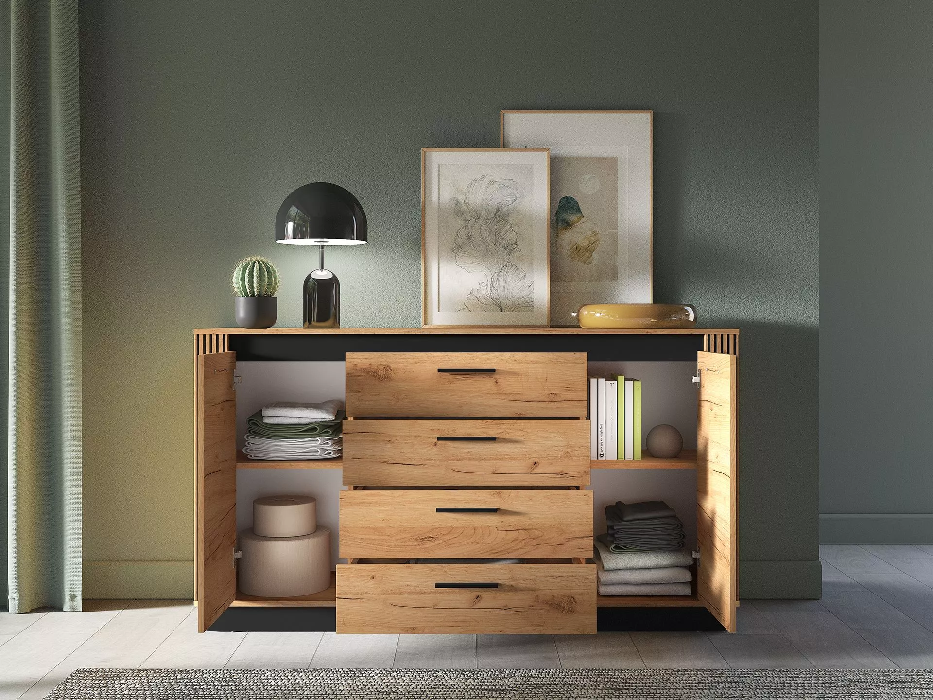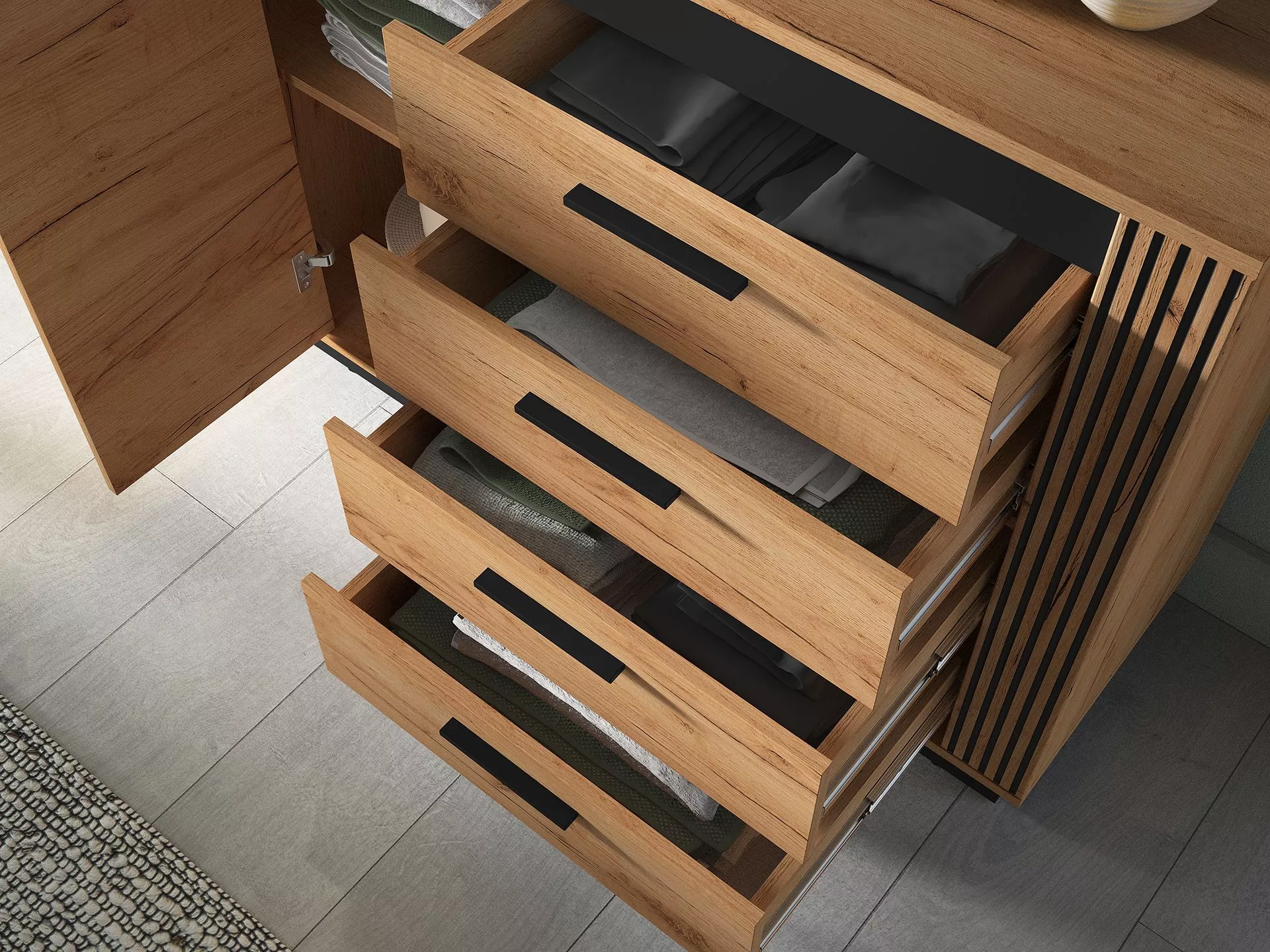 Široká kombinovaná komoda MING dokonale zapadne do moderních interiérů. Má dostatečný úložný prostor ve 2 uzavíratelných skříňkách a 4 prostorných šuplících.