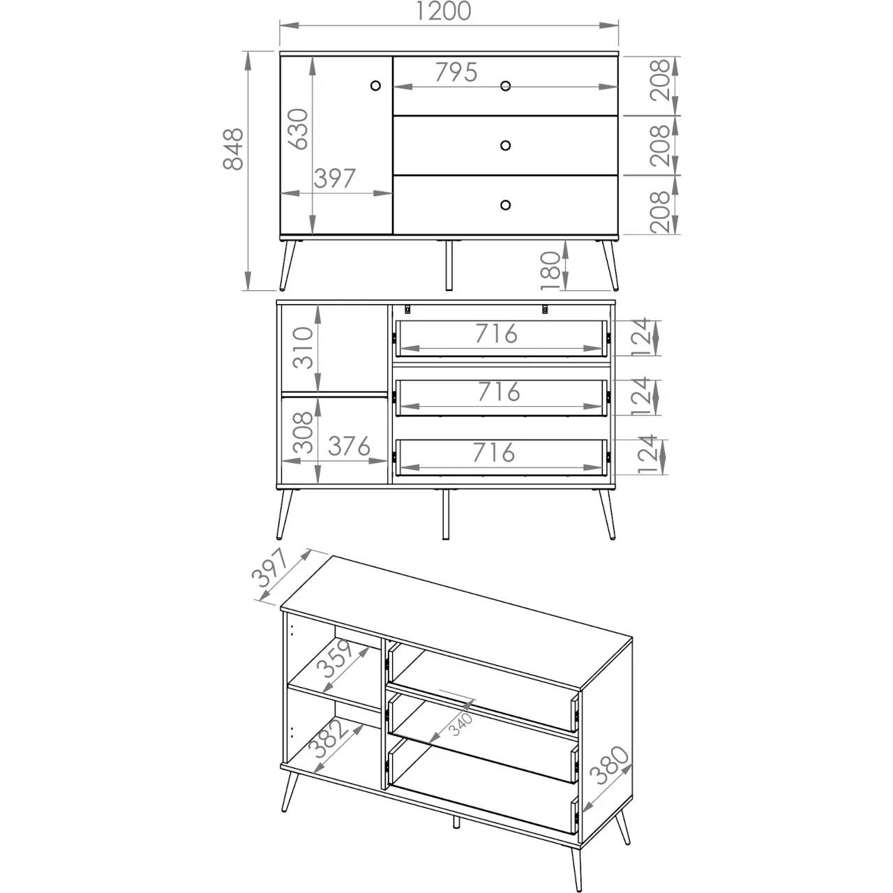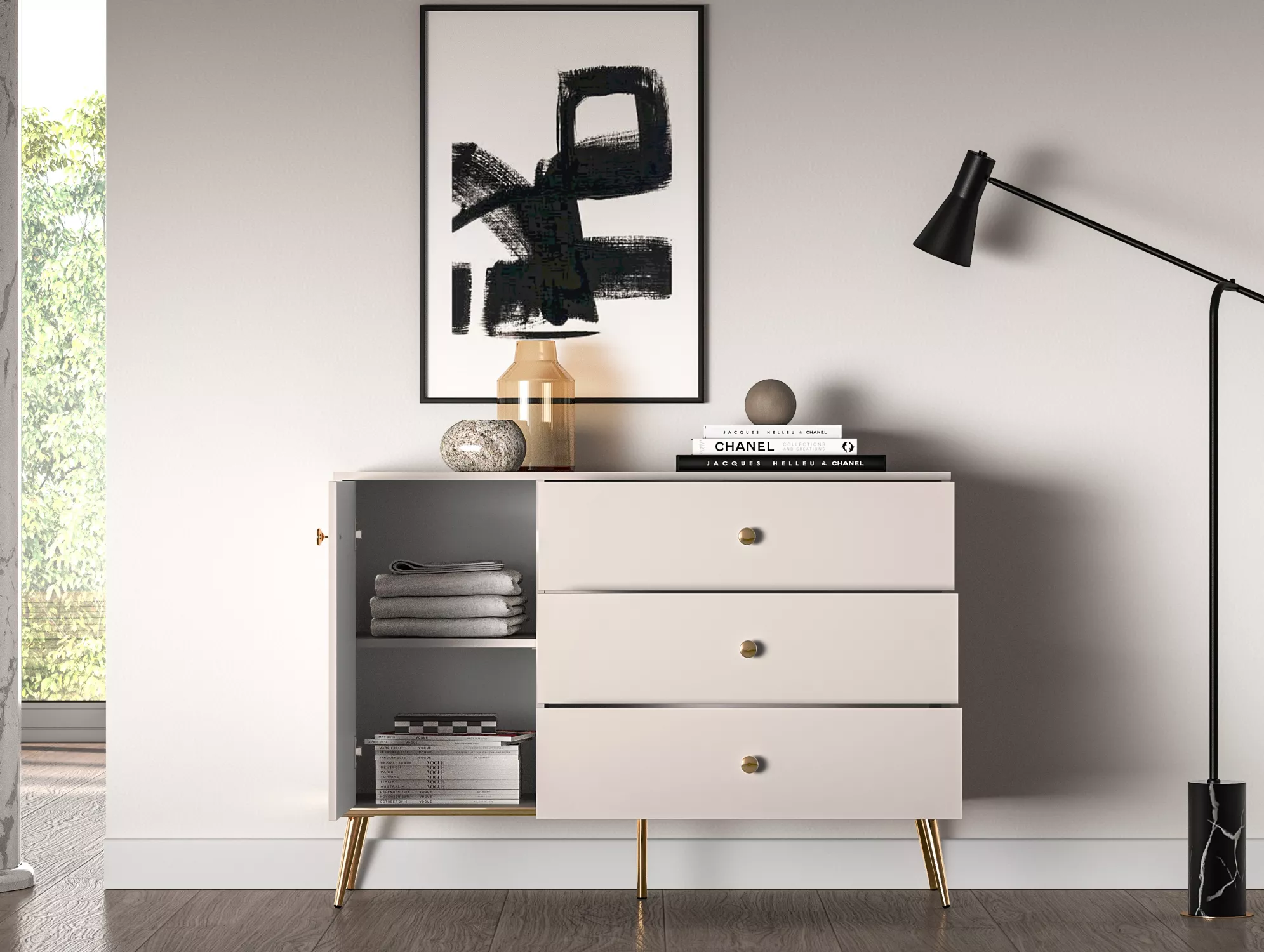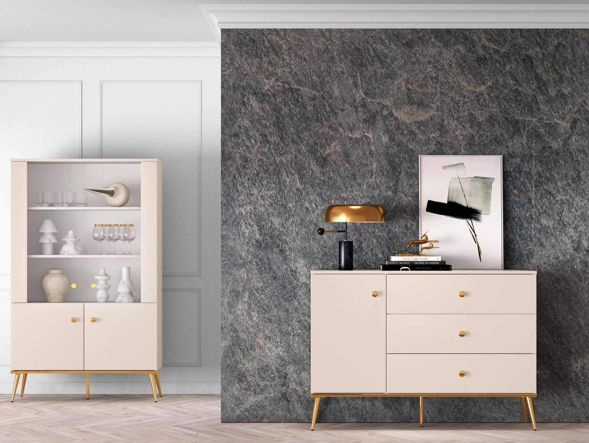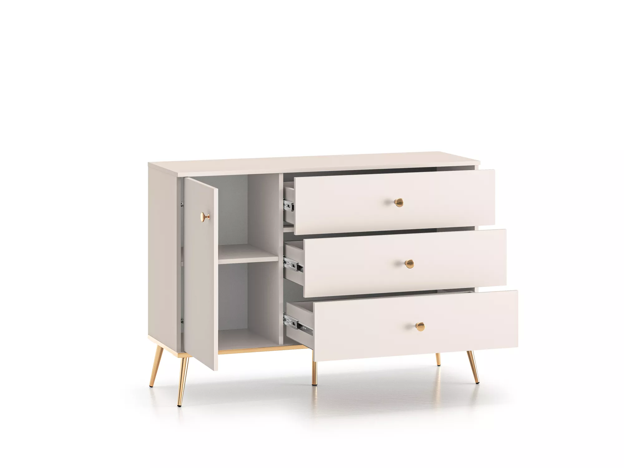 Kombinovaná komoda LUNA byla vytvořena s ohledem na maximální funkčnost. Je vybavena 3 prostornými šuplíky a uzavřenou skříňkou s policí, která usnadňuje organizaci uložených věcí. Kombinace kašmírových předních dílů s vysokými zlatými nožičkami tvoří harmonický celek, který přitahuje pozornost.