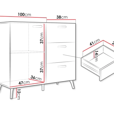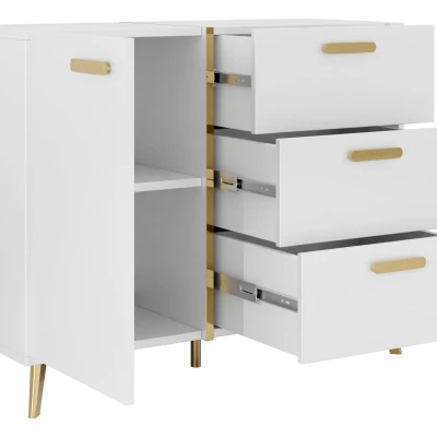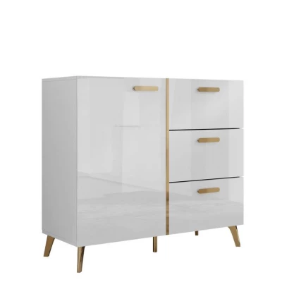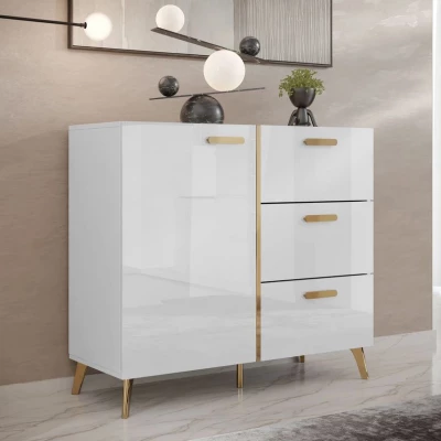Úzká kombinovaná komoda TANTES je stylovým a praktickým doplňkem do každého interiéru. V obývacím pokoji se stane elegantním designovým prvkem, v ložnici nabídne dostatek prostoru pro oblečení a v předsíni pomůže s uspořádáním obuvi a doplňků. Lesklá dvířka v kombinaci se zlatými detaily dodávají komodě luxusní vzhled. Praktické zásuvky jsou ideální pro drobnosti, které chcete mít po ruce, zatímco uzavíratelná skříňka poskytuje prostor pro větší předměty.