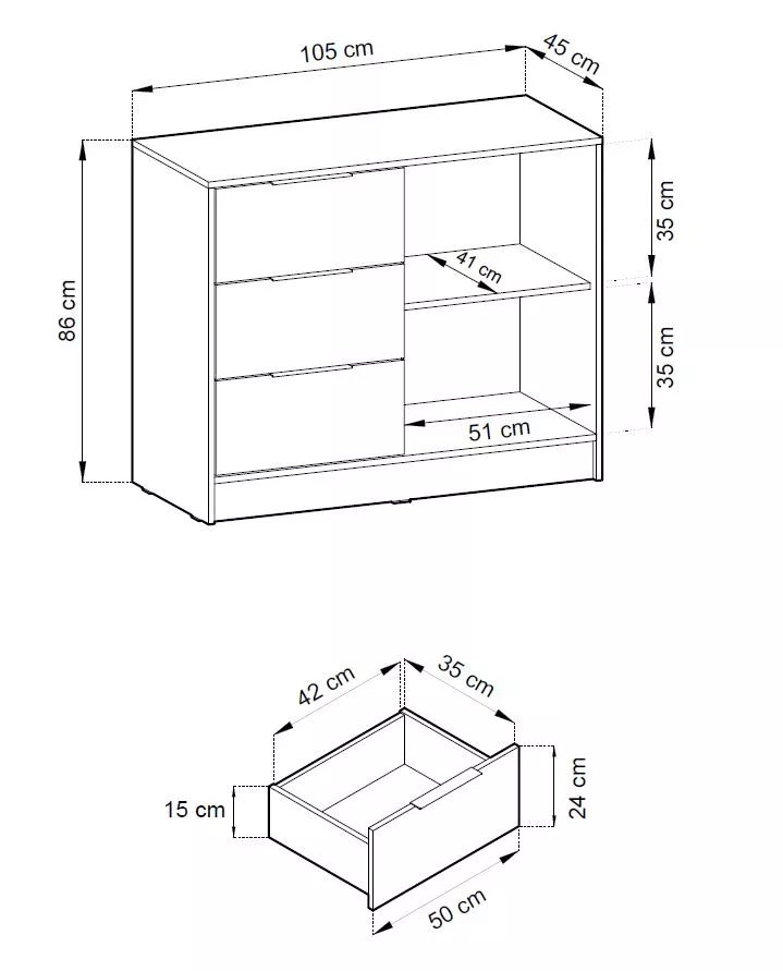 Kombinovaná komoda MARFA spojuje moderní styl s industriálním vzhledem – dřevěný dekor a jednoduché tvary připomínají atmosféru městských loftů. Dekorativní lamely na dvířkách dodávají originalitu a zároveň podtrhují čisté linie nábytku. Díky promyšlenému vnitřnímu uspořádání nabízí vysokou funkčnost a dostatek úložného prostoru pro vše, co chcete mít po ruce i elegantně skryté.
