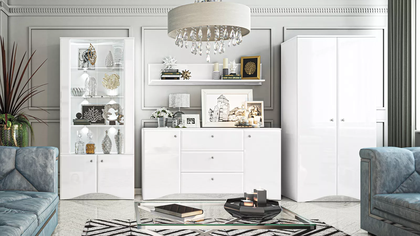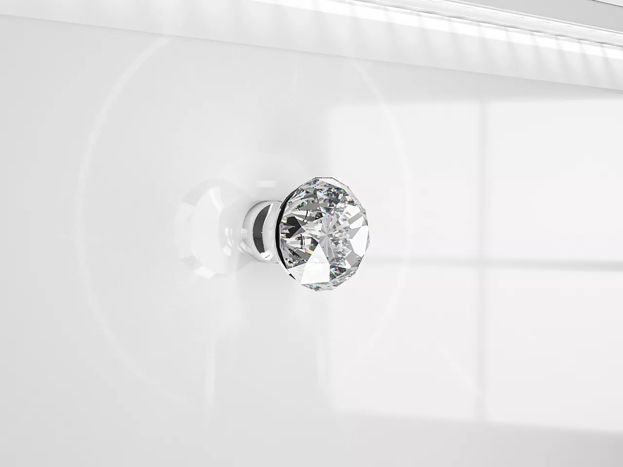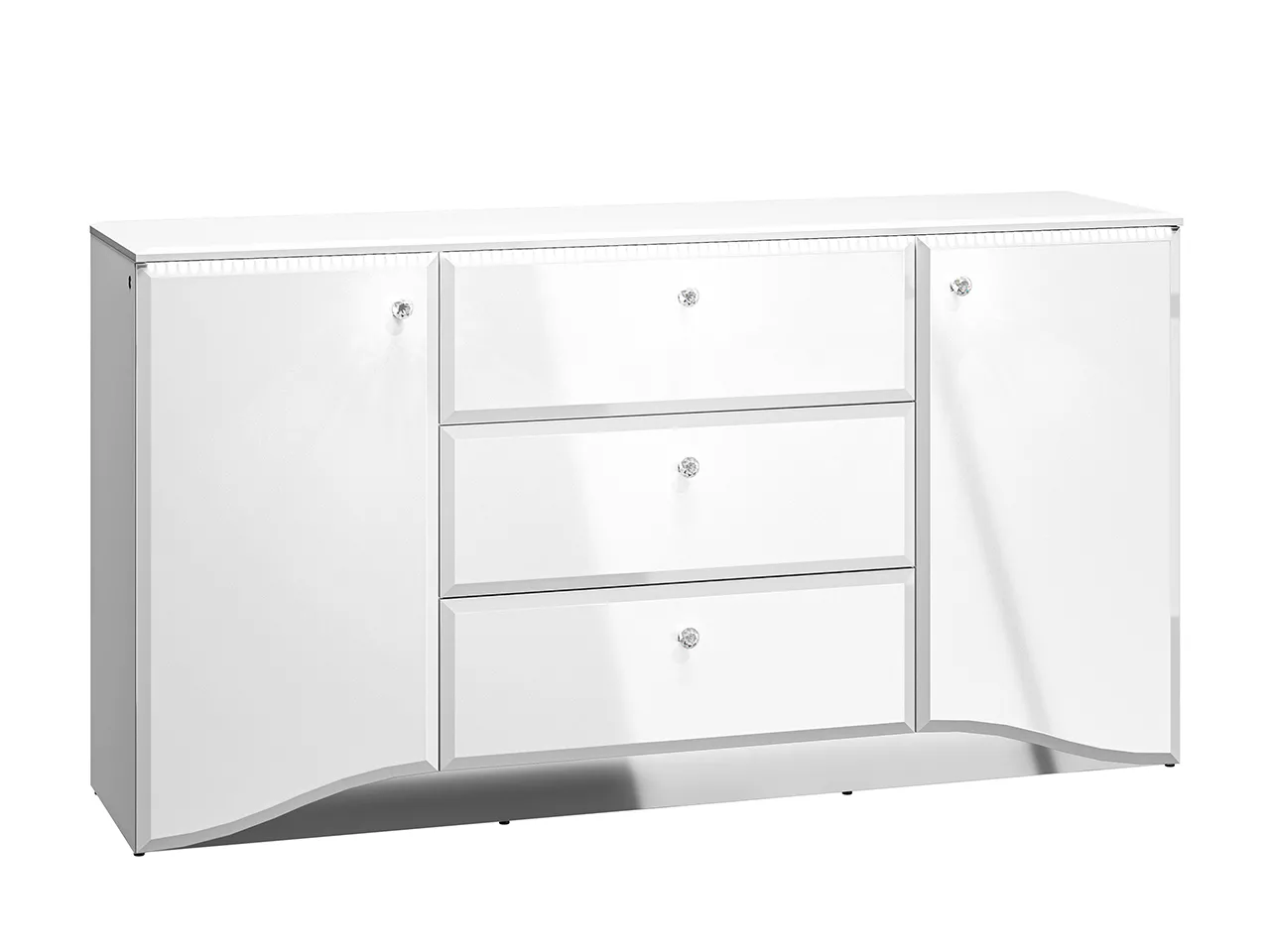 Kombinovaná komoda SANTINA nabízí spoustu prostoru pro uložení dokumentů nebo dekorací. Eleganci komody podtrhují úchyty s imitací diamantu a LED podsvícení.