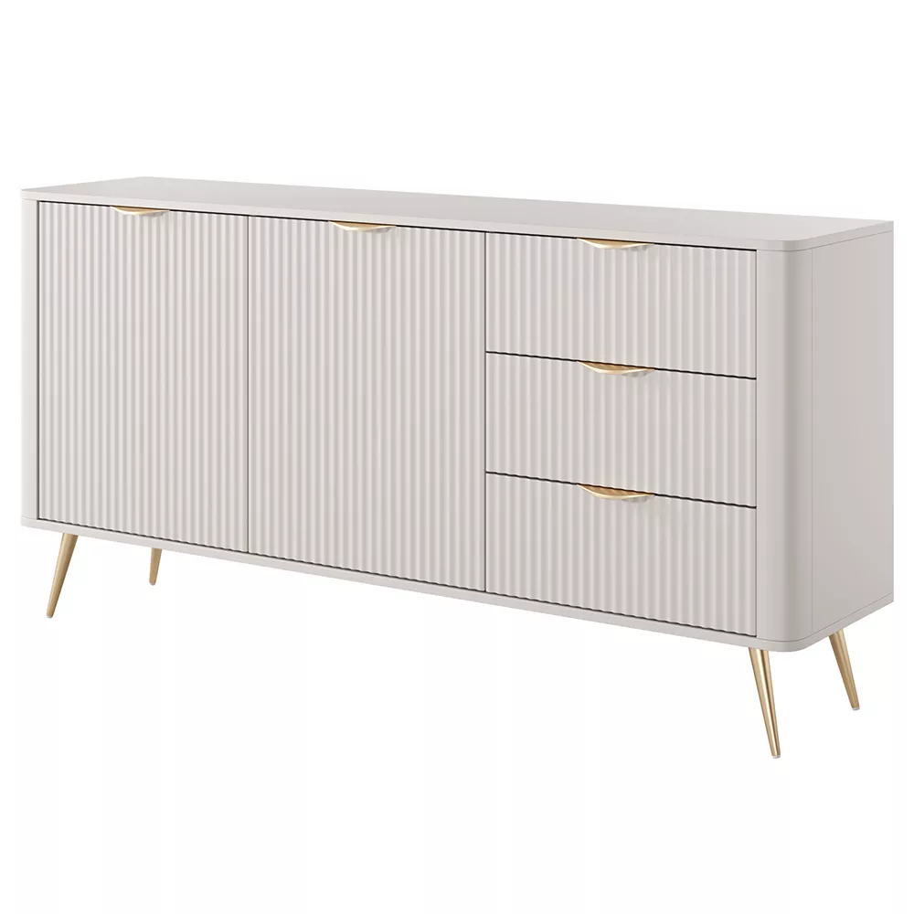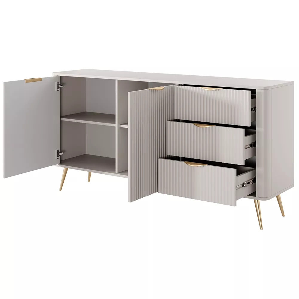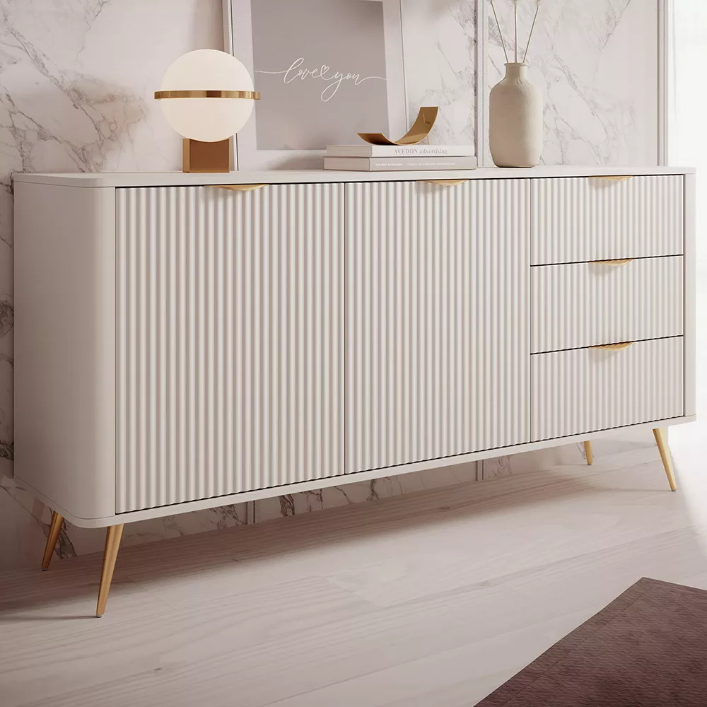 Široká kombinovaná komoda MOODY vám umožní vytvořit aranžmá plné harmonie, jemnosti a elegance. Zaoblené hrany a drážkované přední díly dodávají komodě moderní nádech a originalitu. Design komody je inspirován glamour stylem, ideální pro ty, kteří si potrpí na moderní formy a sofistikovanou eleganci.