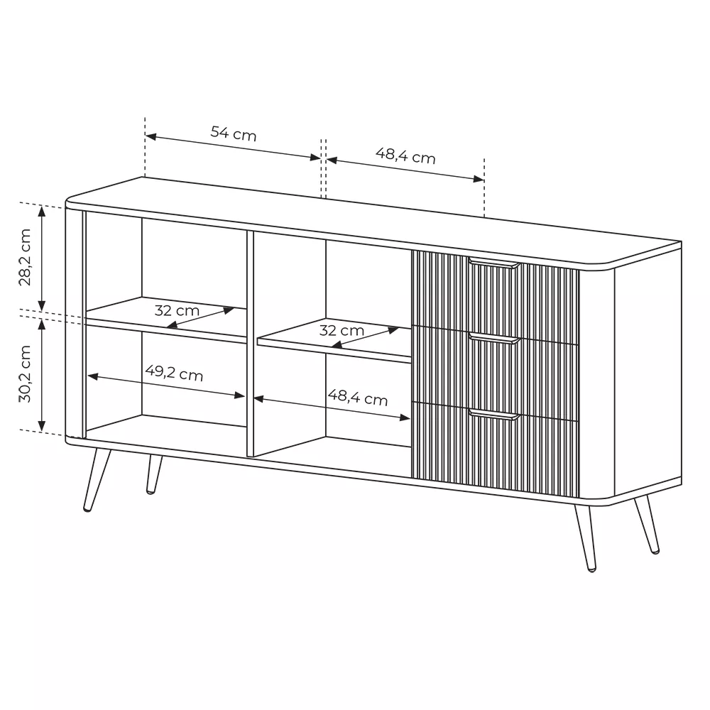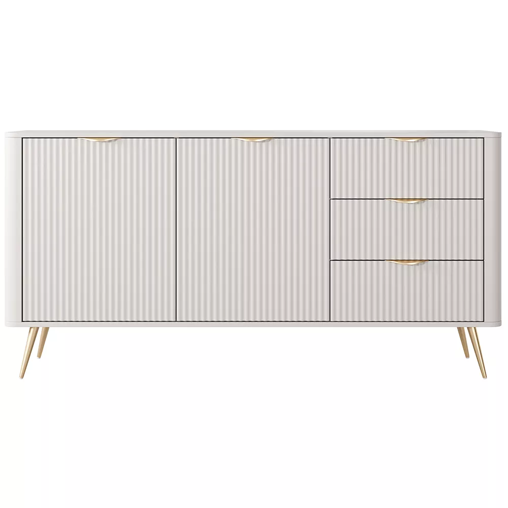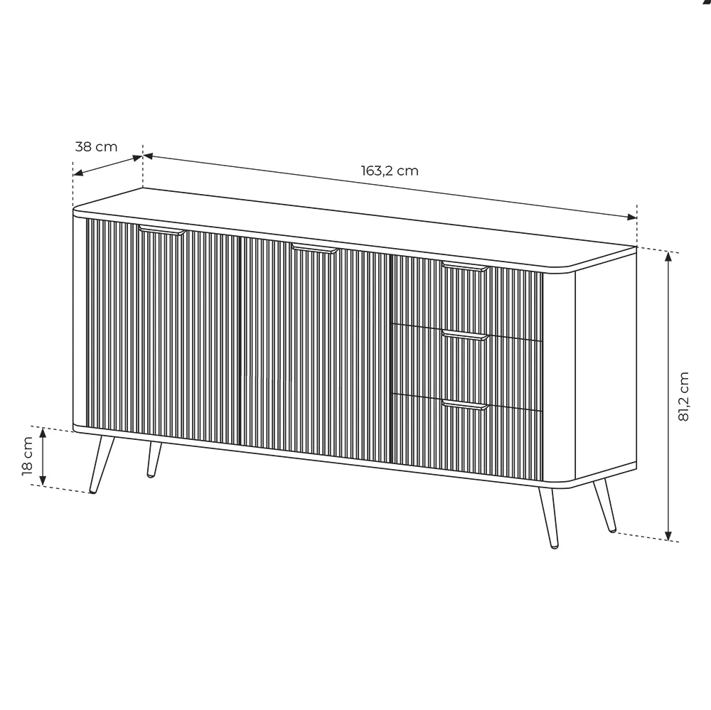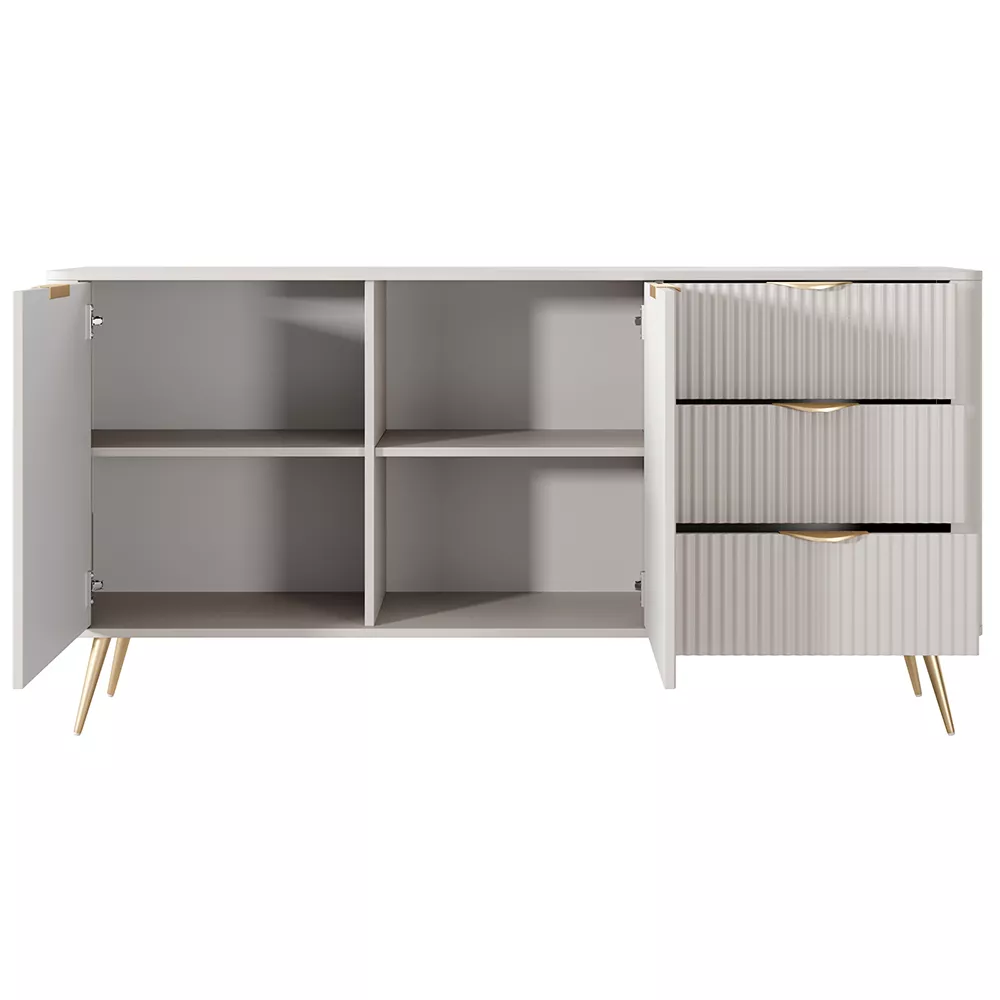 Široká kombinovaná komoda MOODY vám umožní vytvořit aranžmá plné harmonie, jemnosti a elegance. Zaoblené hrany a drážkované přední díly dodávají komodě moderní nádech a originalitu. Design komody je inspirován glamour stylem, ideální pro ty, kteří si potrpí na moderní formy a sofistikovanou eleganci.