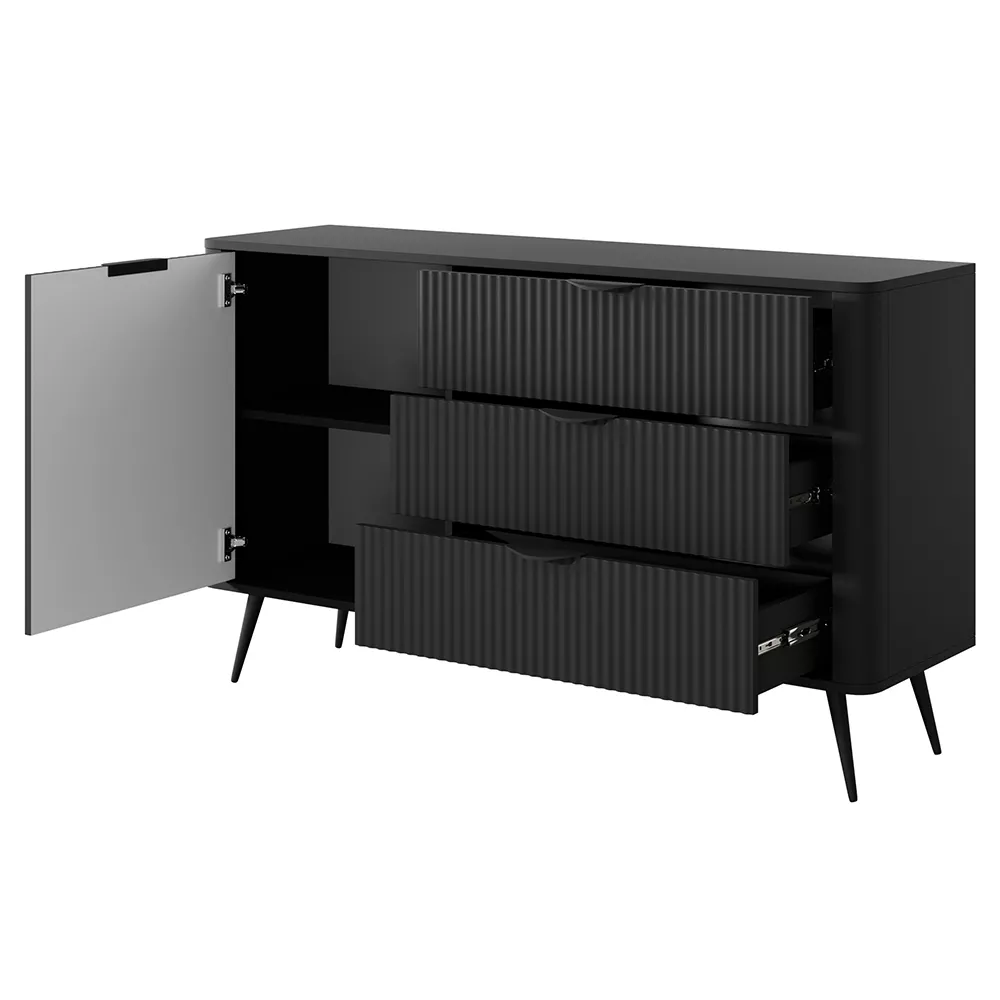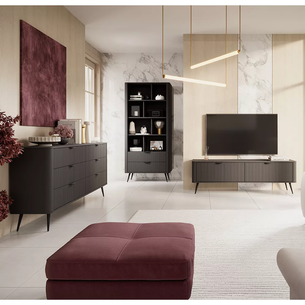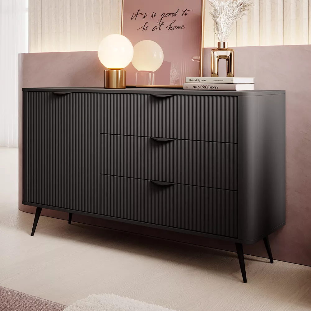 Kombinovaná komoda MOODY vám umožní vytvořit aranžmá plné harmonie, jemnosti a elegance. Zaoblené hrany a drážkované přední díly dodávají komodě moderní nádech a originalitu. Design komody je inspirován glamour stylem, ideální pro ty, kteří si potrpí na moderní formy a sofistikovanou eleganci.
