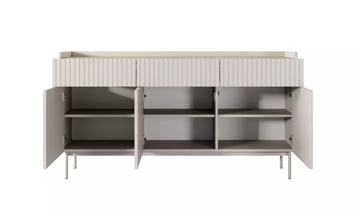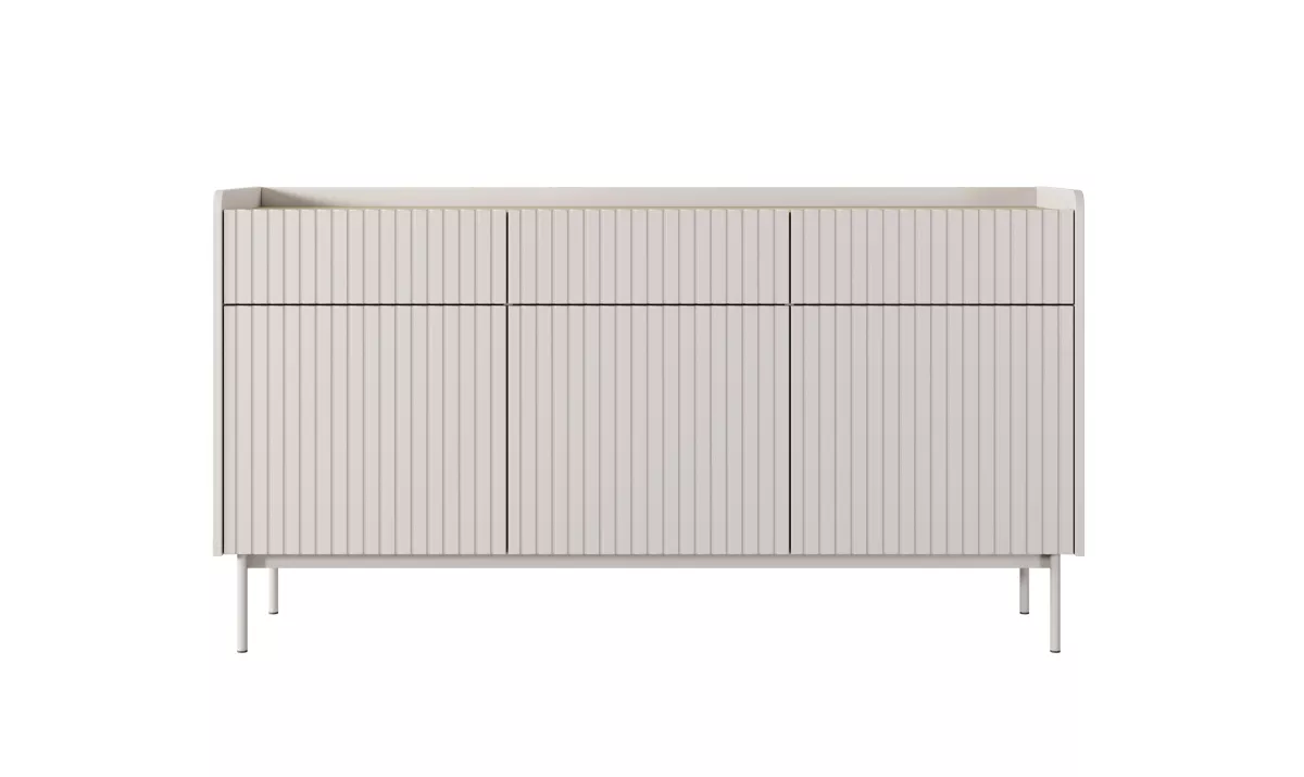 Kombinovaná komoda MATION s drážkovanými dvířky a čely zásuvek odráží současné designové trendy. Kolekce harmonicky kombinuje odstíny béžové barvy a světlého dřeva s jemnými detaily, jako jsou zaoblené boky a snížená horní deska v dekoru skandinávského dubu. Kovové nohy pak dodávají celku lehkost. Symetrický, minimalistický tvar zůstává originální a moderní zároveň.