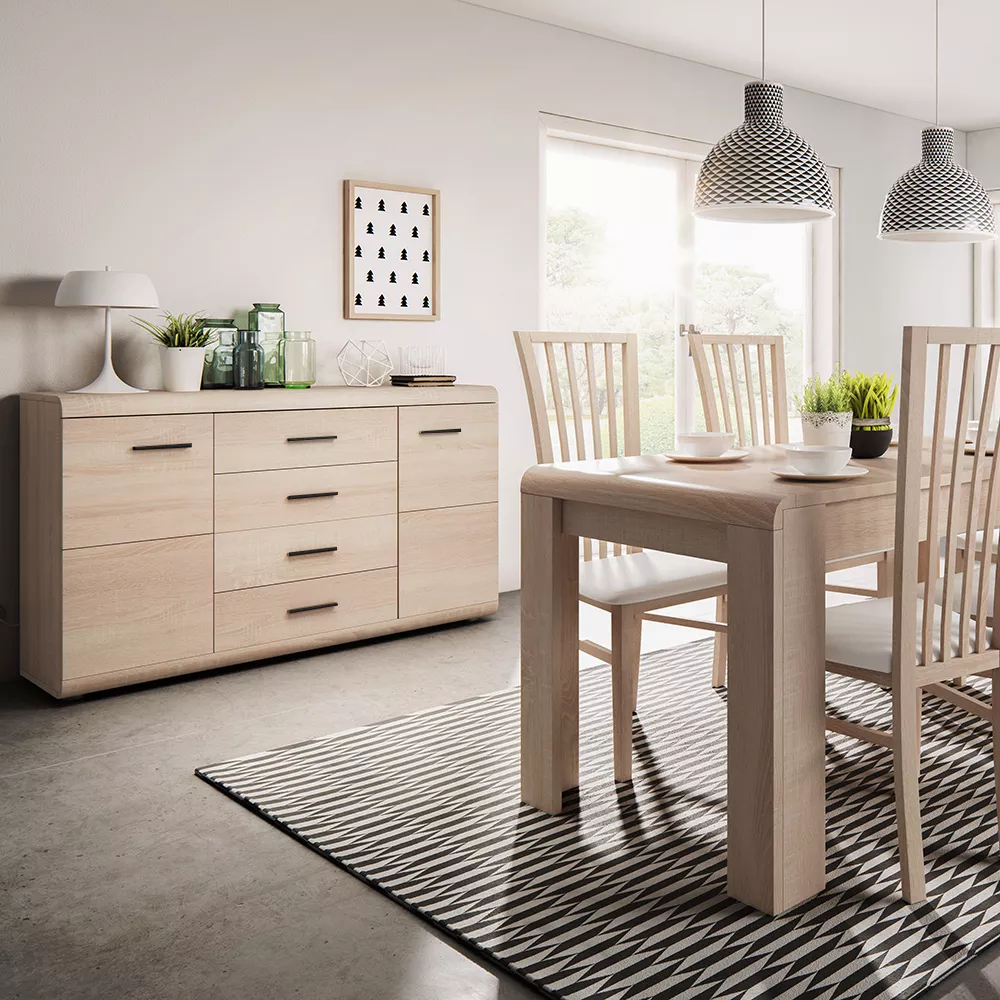 Kombinovaná komoda LUVERNE v duchu skandinávského minimalismu propojuje funkčnost s jemnou elegancí inspirovanou přírodou. Dvě boční uzavřené skříňky skryjí vše, co nemá být na očích, zatímco centrální zásuvky přináší praktické a přehledné úložiště pro každodenní potřeby.