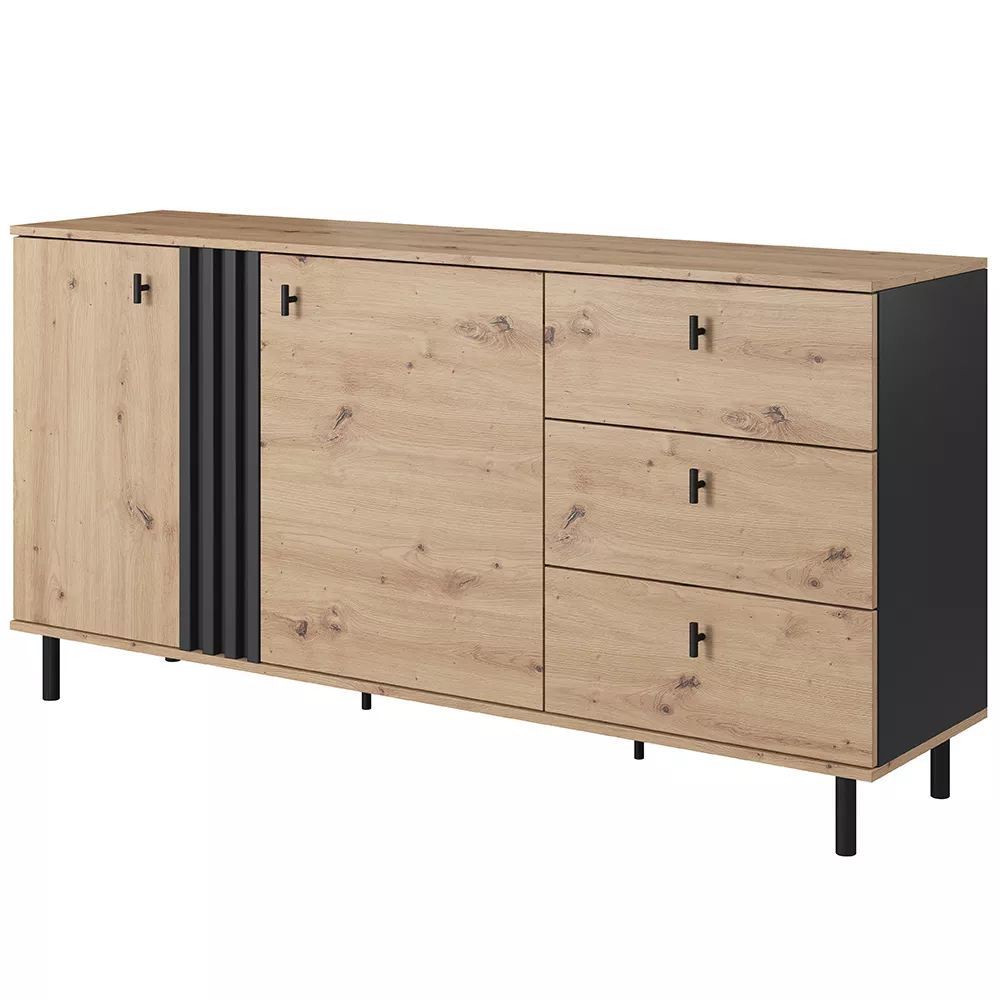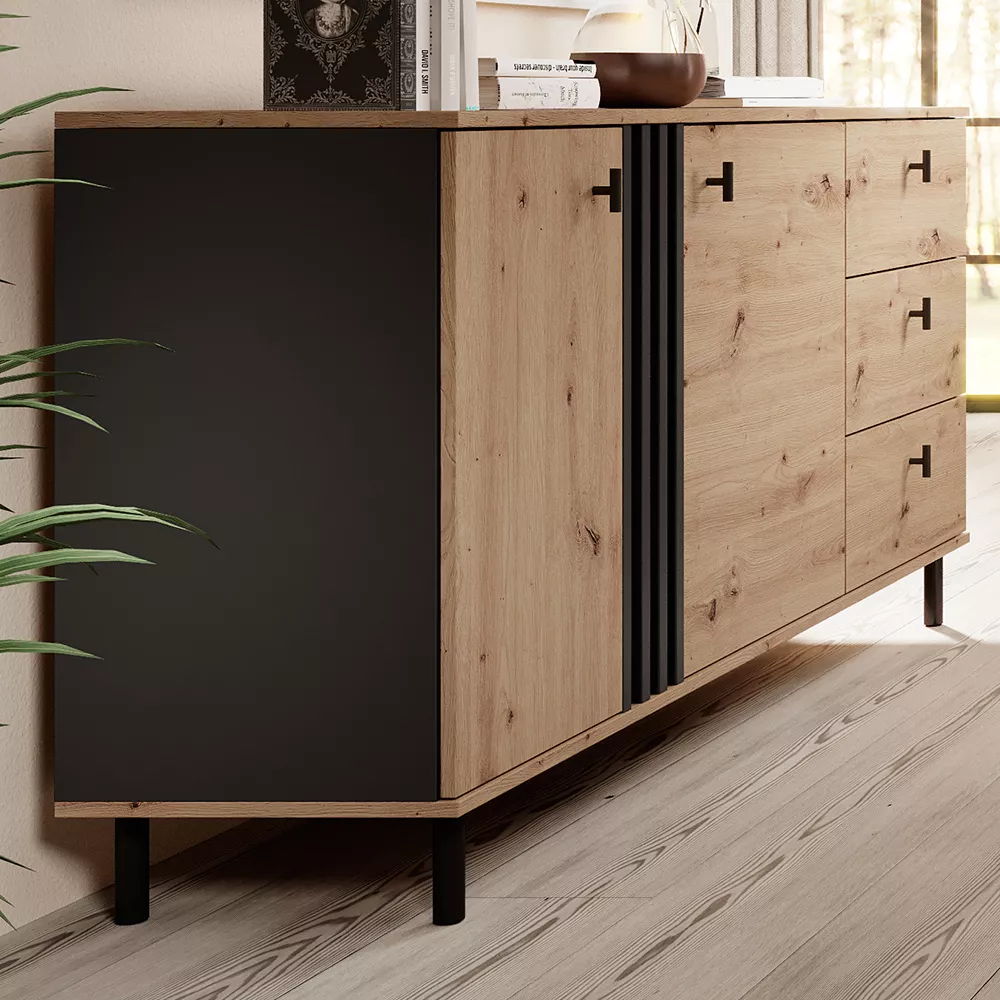Široká kombinovaná komoda CHATOM zaujme na první pohled kontrastem dekoru dubu artisan a elegantní antracitové barvy, který podtrhuje moderní výraz celé komody. Decentní lamely, svislé úchytky vyrobené na míru a černé kovové nohy vytvářejí harmonii tvarů a lehkost. S praktickým rozvržením 2 uzavřených skříněk a zásuvek nabízí komoda nejen styl, ale i promyšlenou funkčnost pro náročného uživatele.