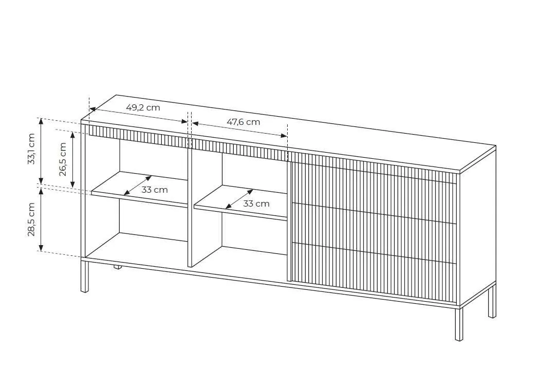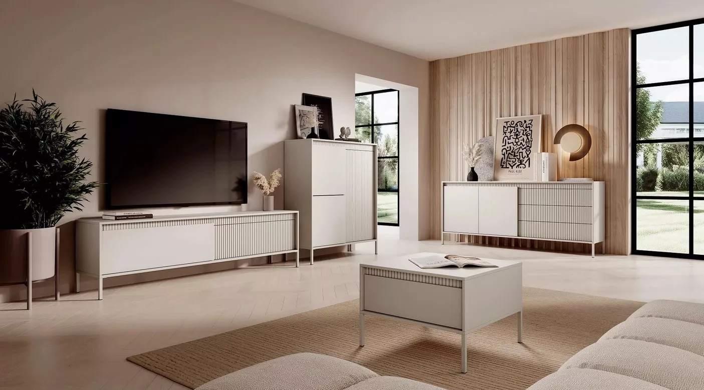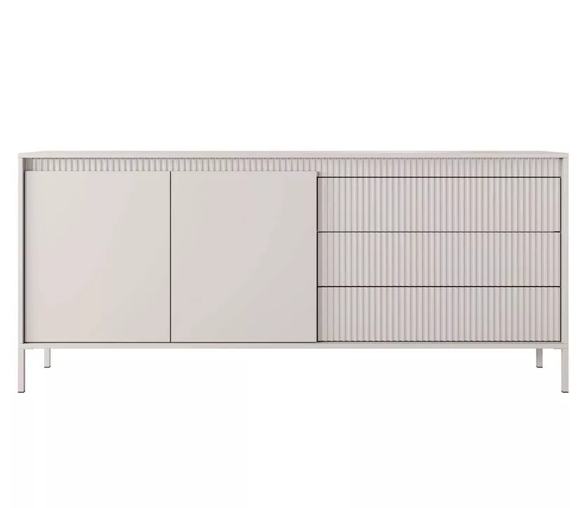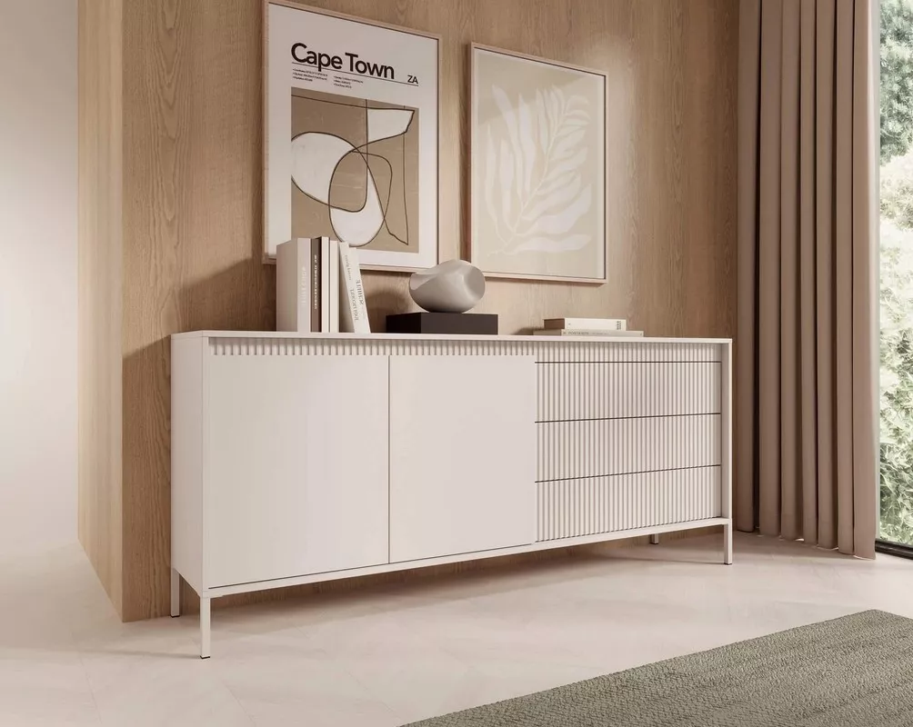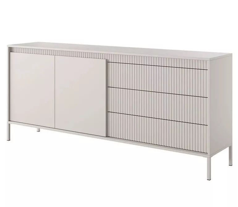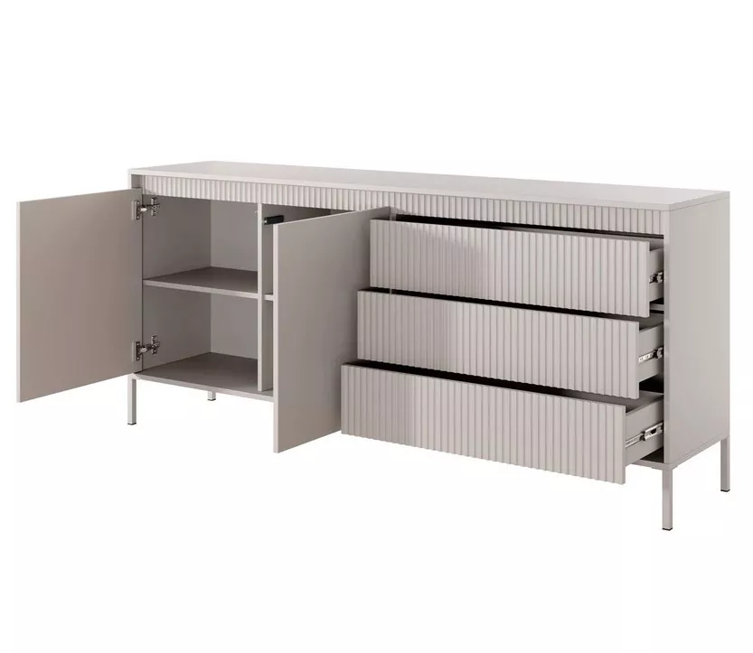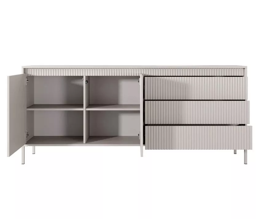 Jedinečná elegance – to je široká kombinovaná komoda MOULTON. Spojením drážkovaných dvířek a hladkých, jemně vystupujících čel vyniká svou moderností a smyslem pro detail. Vysoké kovové nožky dodávají lehkost, a zároveň usnadňují úklid. Moderní systém otevírání PUSH TO OPEN zaručuje pohodlnou každodenní manipulaci a přináší čistý, nerušený vzhled.