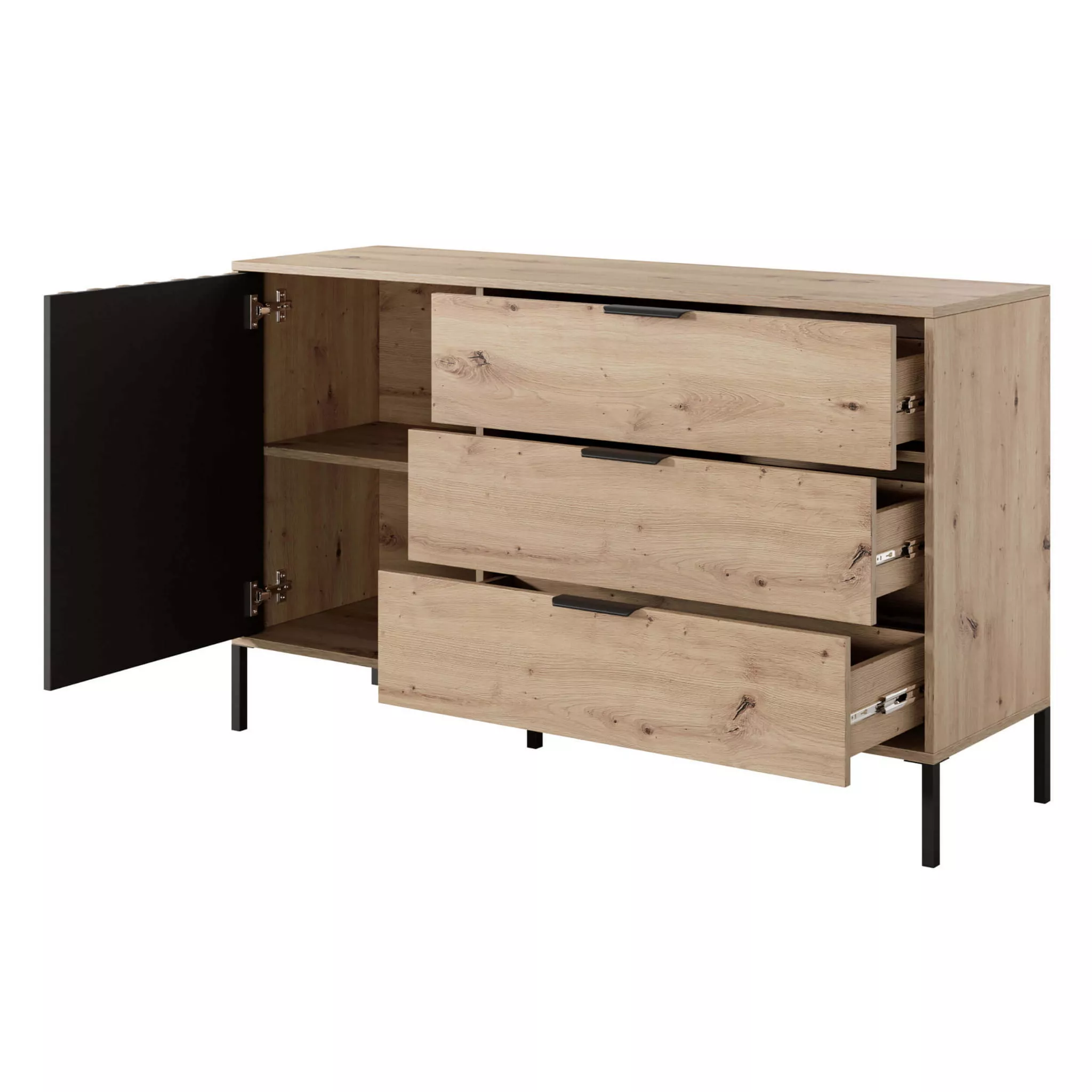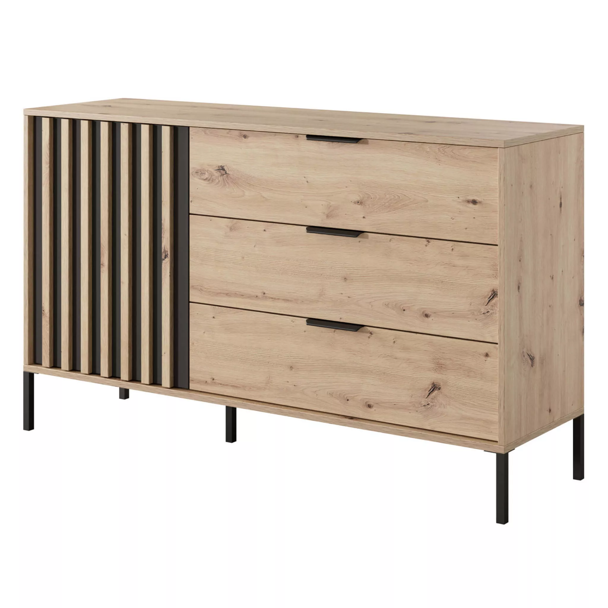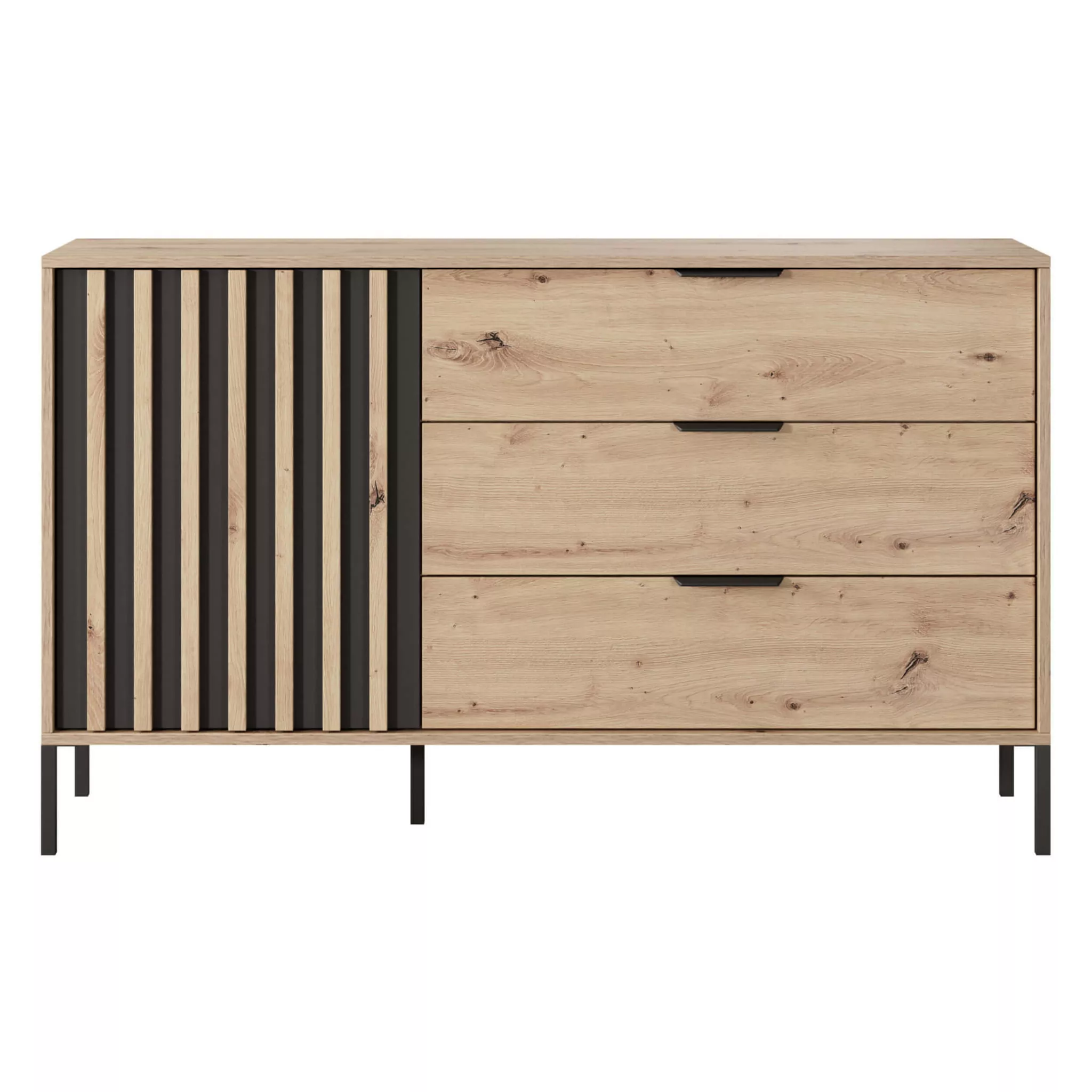 Kombinovaná komoda REFORM zaujme dokonalou souhrou tlumených zemitých tónů – teplý dub artisan a hluboká antracitová barva dodávají interiéru přírodní a útulný nádech. Dekorativní lamely na dvířkách podtrhují moderní charakter a elegantní linie celé komody. Díky prostornému vnitřnímu uspořádání je mimořádně funkční a ideální pro každodenní využití.