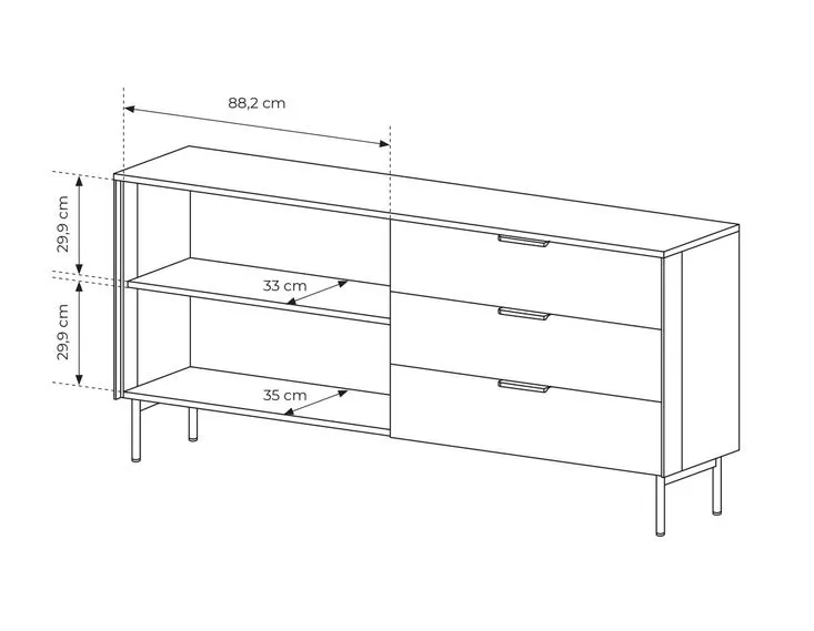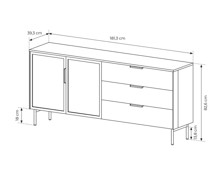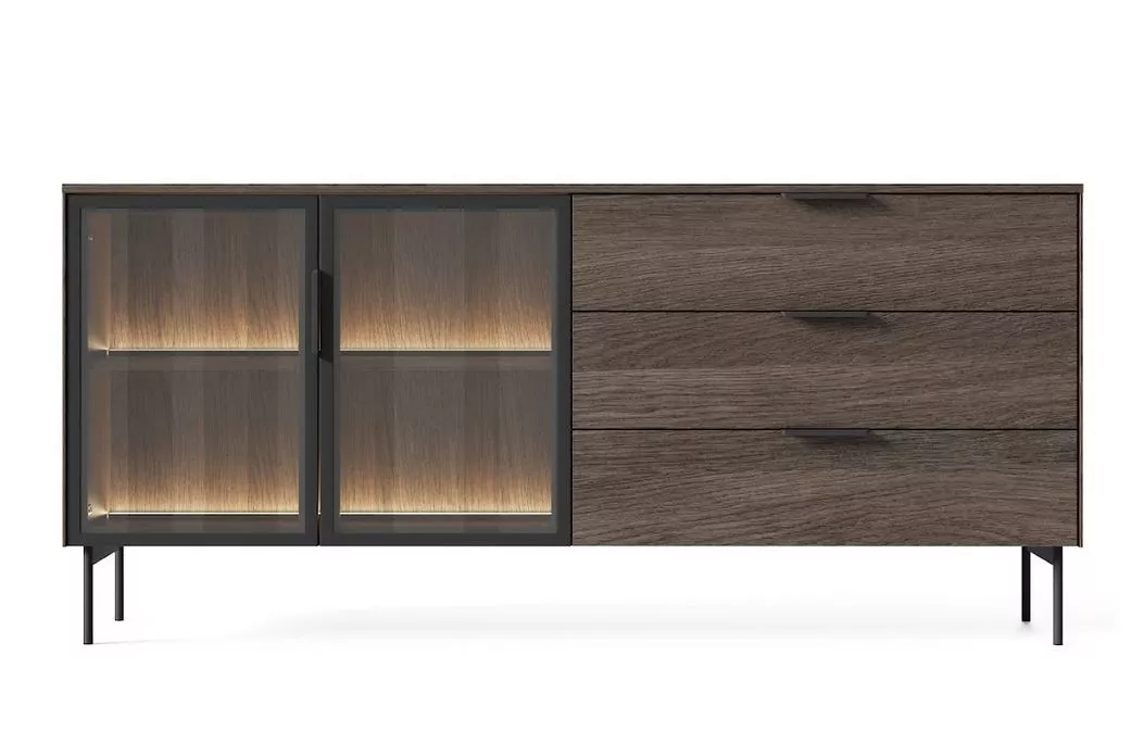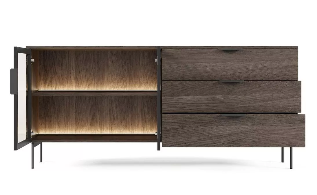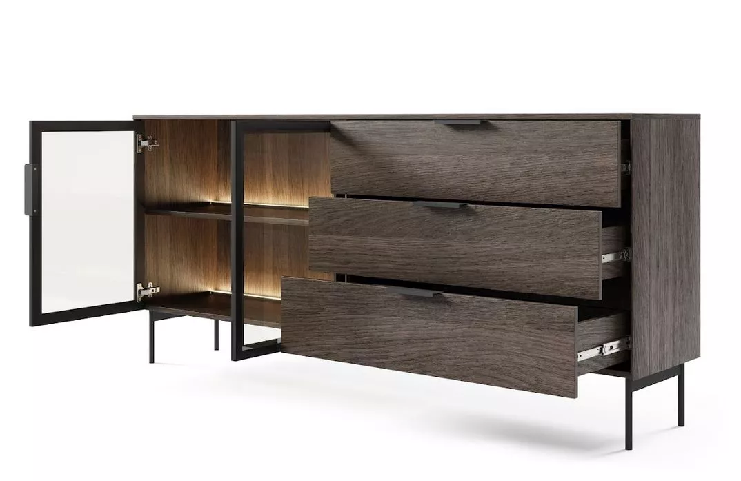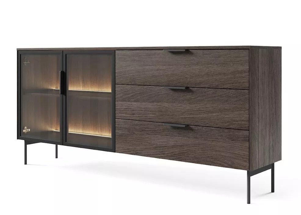 Vneste do interiéru šmrnc a eleganci s prosklenou širokou kombinovanou komodou SULIGENT. Hluboké police za sklem jsou ideální pro vystavení dekorací i praktických doplňků, zatímco šuplíky diskrétně uschovají důležité dokumenty. Kovové černé úchyty a vysoké nožky dodávají nábytku luxusní nádech, zatímco LED osvětlení zvýrazní každý detail a navodí příjemnou atmosféru.