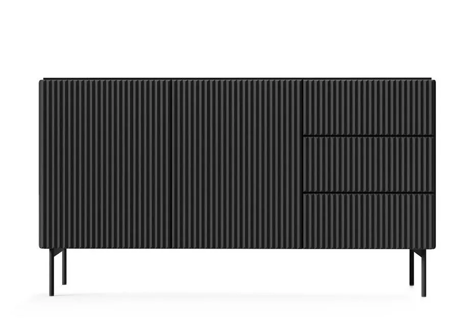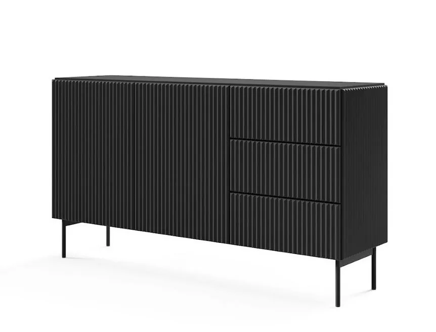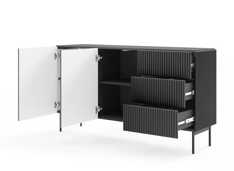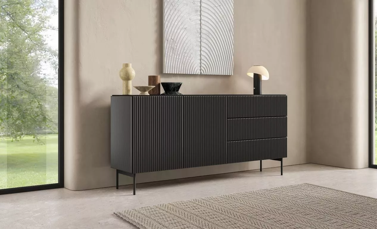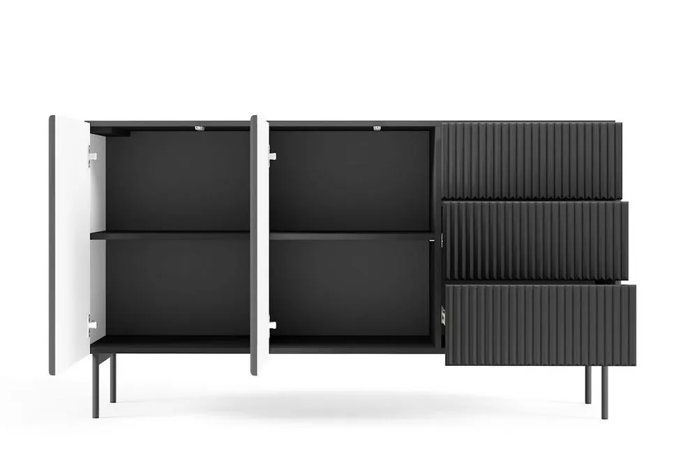 Vylepšete svůj interiér komodou s dvířky a šuplíky BOAZ – harmonickým spojením moderní lehkosti a funkčnosti. Hluboké police a šuplíky poskytují dostatek úložného prostoru, zatímco bezúchytková čela s jemným drážkováním dodávají nábytku charakter i vizuální rytmus. Rovné kovové nožky doplňují celý vzhled a podtrhují nadčasový styl komody inspirovaný nejnovějšími trendy.