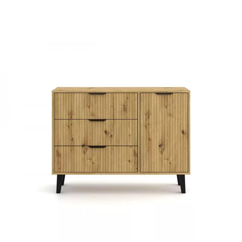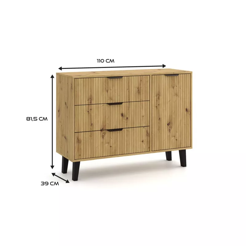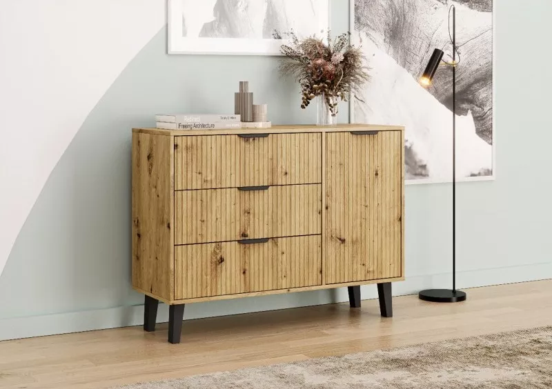 Kombinovaná komoda SITIVE SLIM zaujme především svými drážkovanými čely šuplíků a dvířek. Komoda disponuje 3 prostornými šuplíky a skříňkou s policí. Vysoké nožky dodávají komodě eleganci.