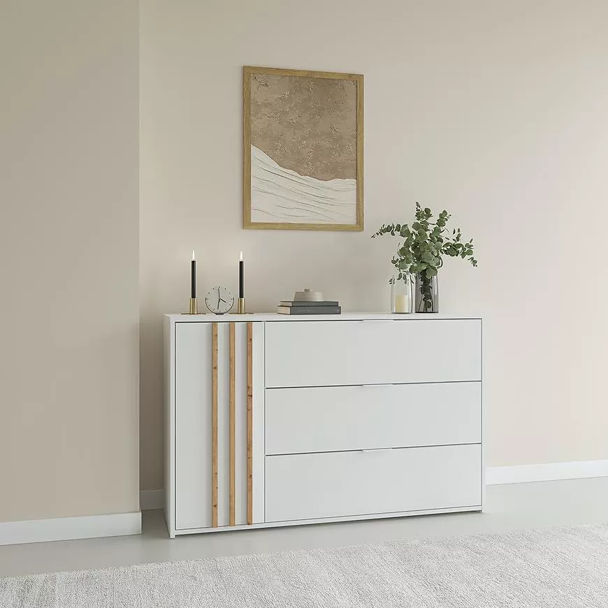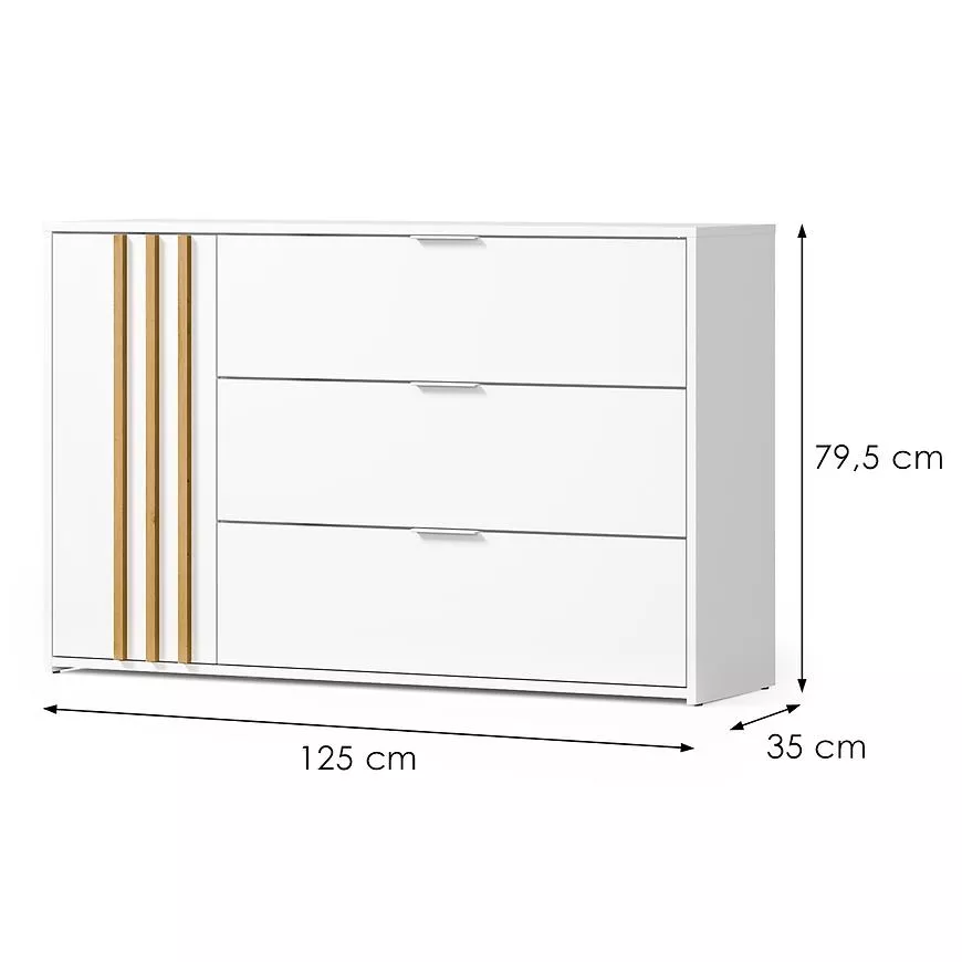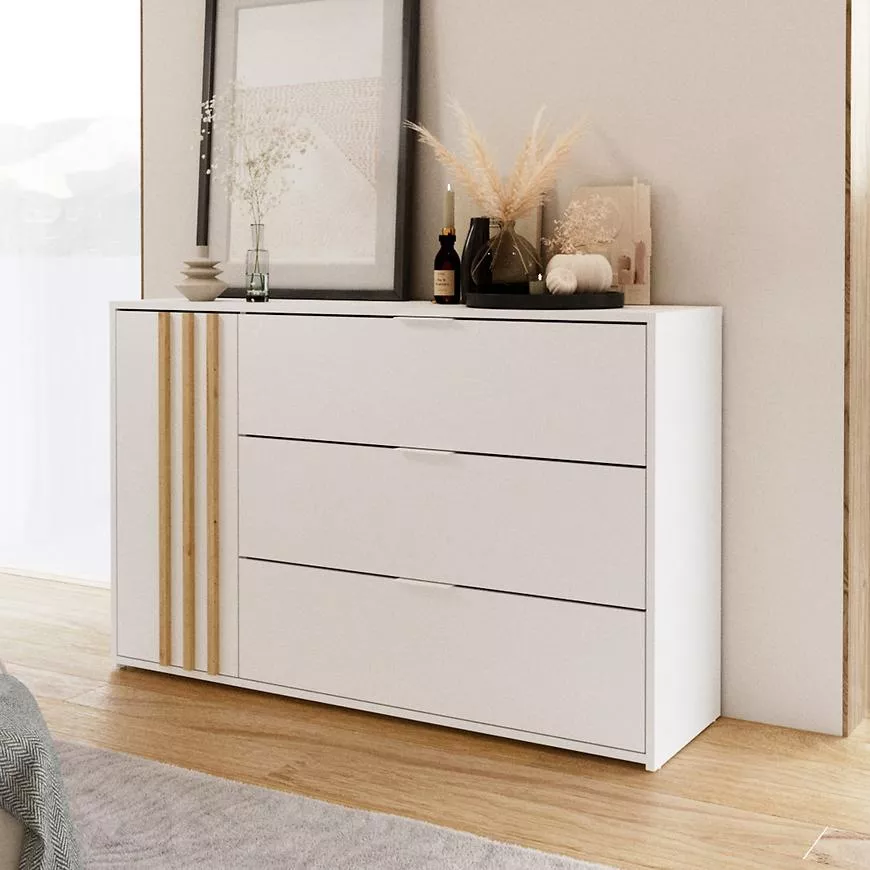 Pořiďte si komodu TURBO, která spojuje čistý styl s praktickým řešením pro každodenní organizaci. 3 zásuvky a prostorná skříňka pohodlně pojme oblečení, doplňky i další drobnosti, které mají zůstat skryté. Ideální volba do interiéru, kde se snoubí funkčnost s útulností. Bílý povrch oživují lamely v dekoru dubu artisan, které dodávají komodě přírodní a moderní vzhled.