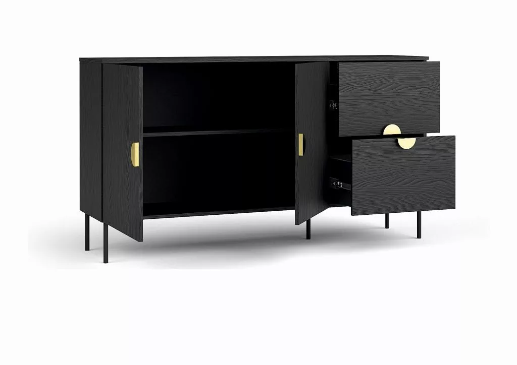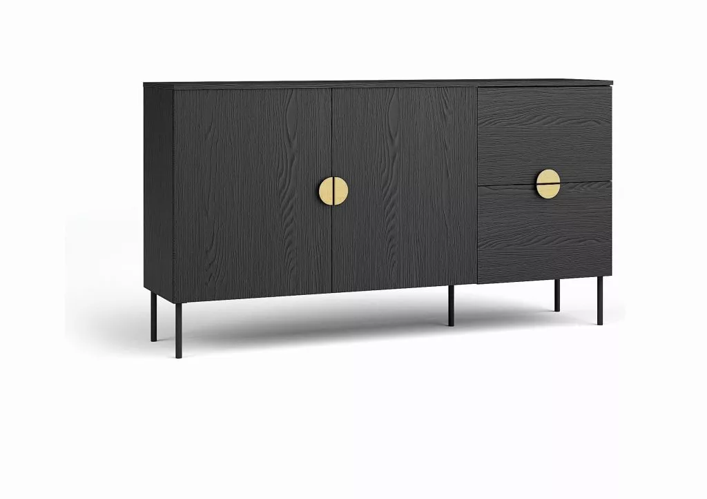 Dopřejte si komodu MOSQURA, která kombinuje luxusní eleganci s praktickým úložným prostorem. 2 šuplíky a prostorná skříňka zajistí pořádek a přehlednost v obývacím pokoji i ložnici. Výrazná textura povrchu přitahuje pozornost a dodává nábytku jedinečný charakter. Černý dekor doplňují zlaté půlkruhové úchytky, které podtrhují industriální a stylový design.
