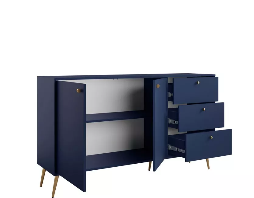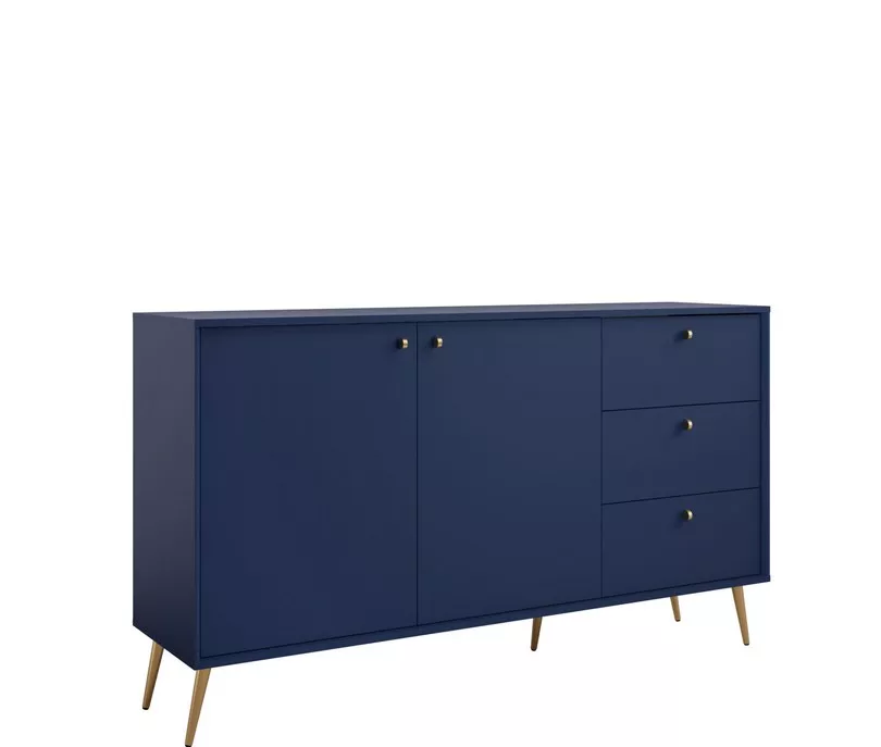 Dopřejte si kombinovanou komodu PITALITO, která zaujme originální kombinací barev i praktičností. Uzavřená skříňka a šuplíky skvěle poslouží pro přehledné uložení všech nezbytností v obývacím pokoji či salónku. Tmavě modré provedení působí noblesně a snadno oživí každý interiér. Zlaté nohy a úchytky dodávají celku elegantní a moderní šmrnc.