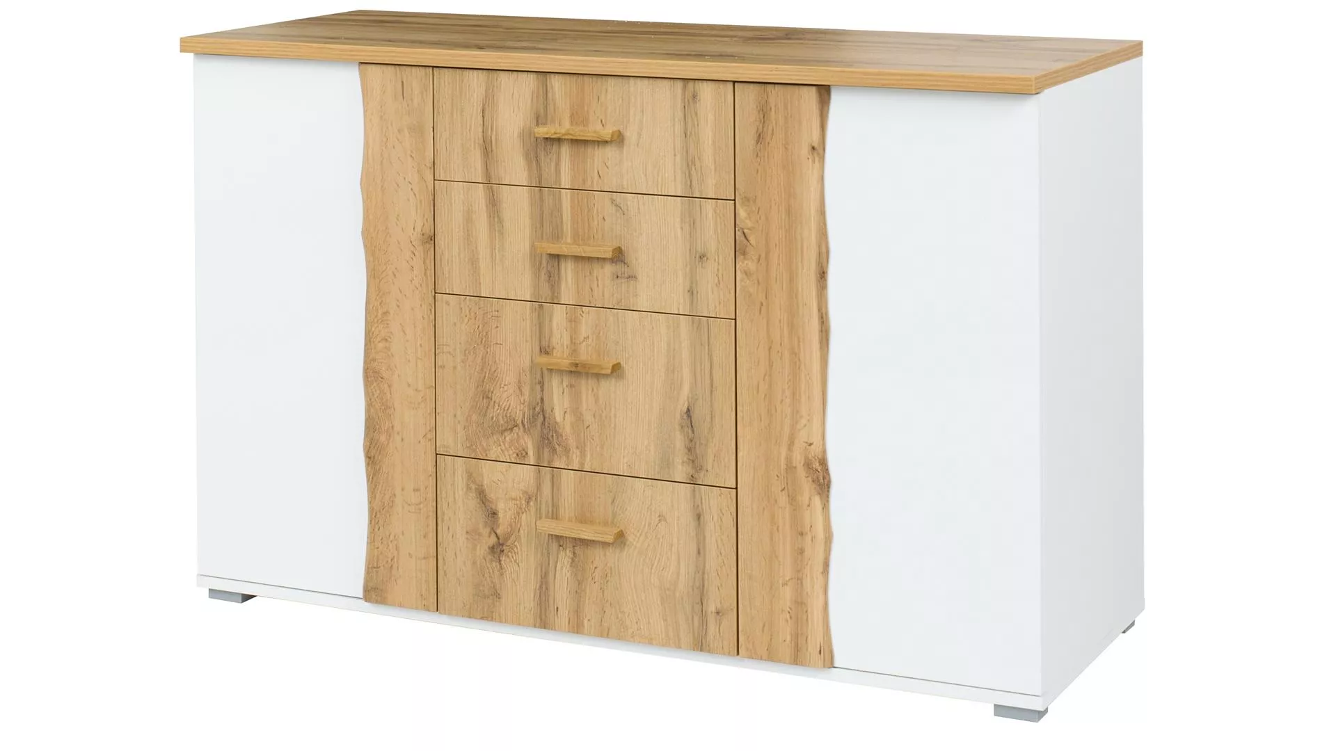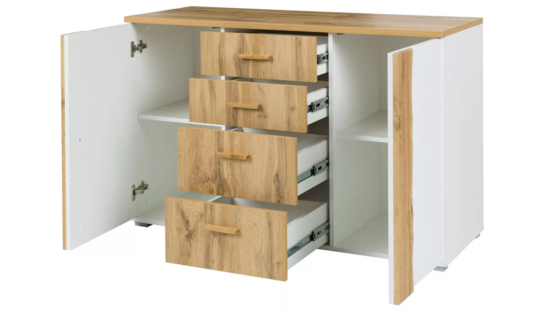 Kombinovaná široká komoda GARZON v módní barevné kombinaci dubu wotan a bílého lesku je perfektní volbou pro milovníky přírodních interiérů s nádechem moderní elegance. Prostorná komoda se 4 šuplíky a 2 skříňkami je ideální místo pro uložení oblečení, doplňků nebo dokumentů.
